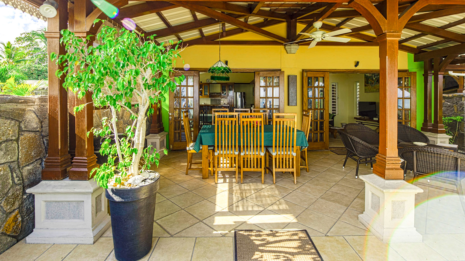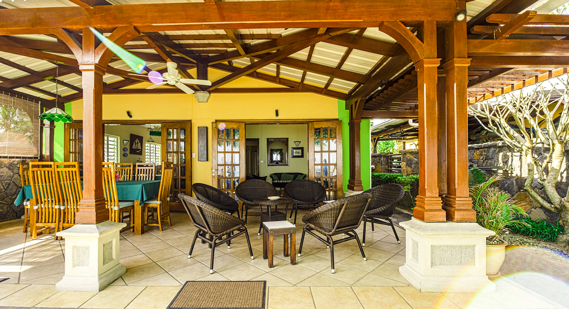 An infinity pool overlooking a beautiful private beach in a quiet area, 30 minutes from the bustling Grand Baie. A new pergola and beach dining table with 2 benches for 12 seatings has been added. Linens and towels are provided. The services of a housekeeper, a cook (breakfast and lunch) and a gardener are also included in the rental price. Pool size : 12m X 4 m Pool can be fenced on request (vertical poles and net).​ The villa has 8 rooms, including five bedrooms. Two rooms are in the wings at the rear of the house, around a patio. There is also a separate kitchen, 3 bathrooms and 3 separate toilets.