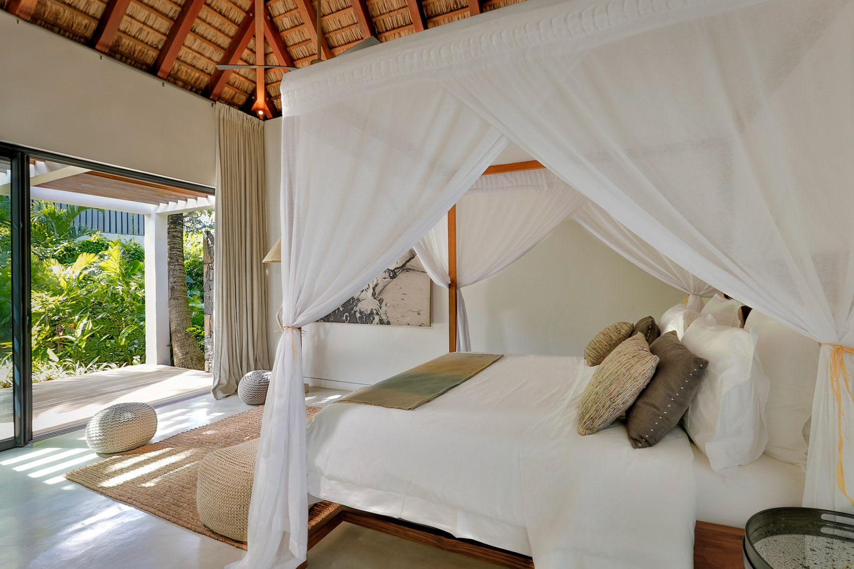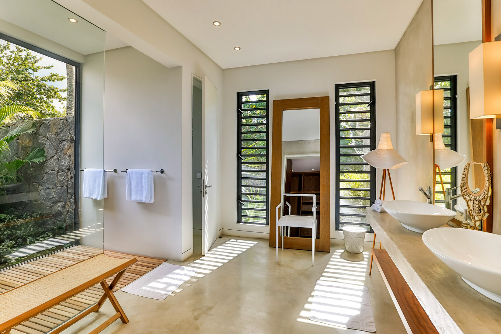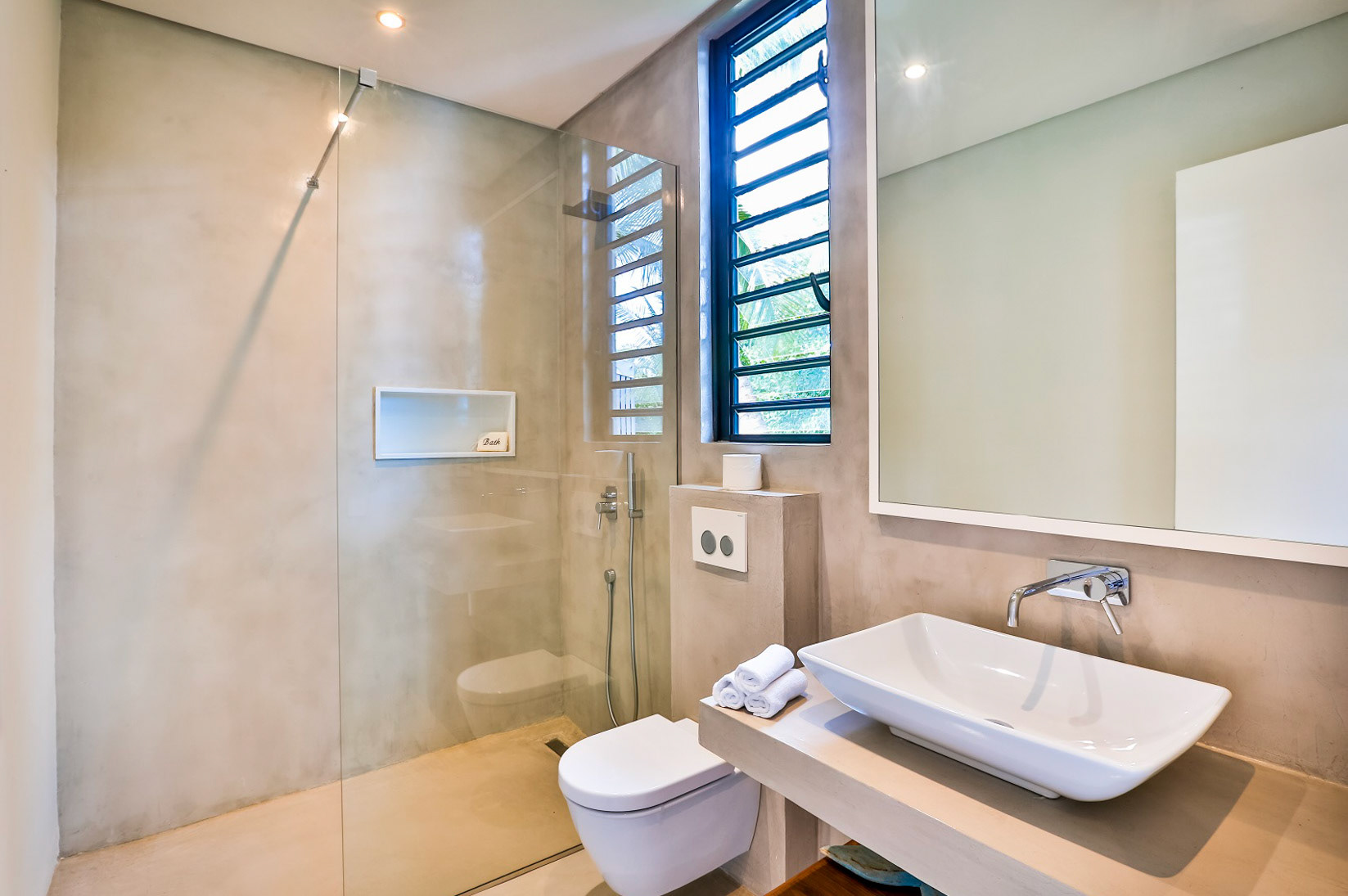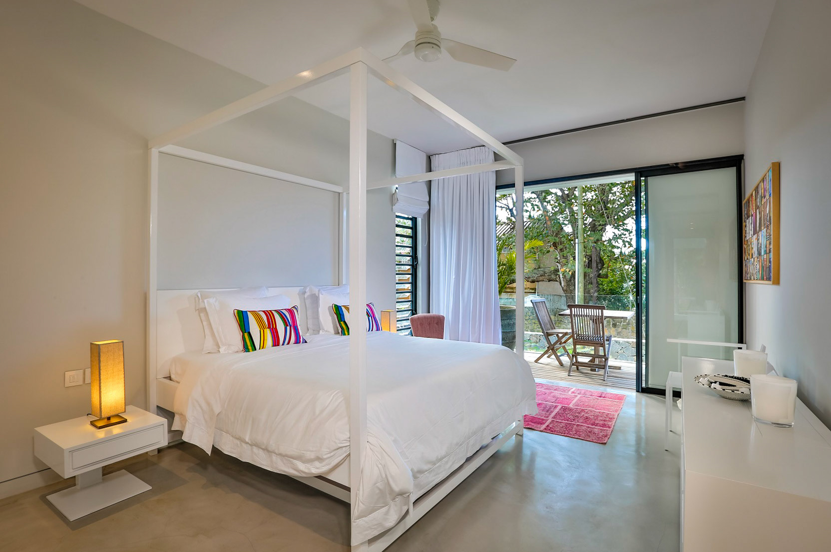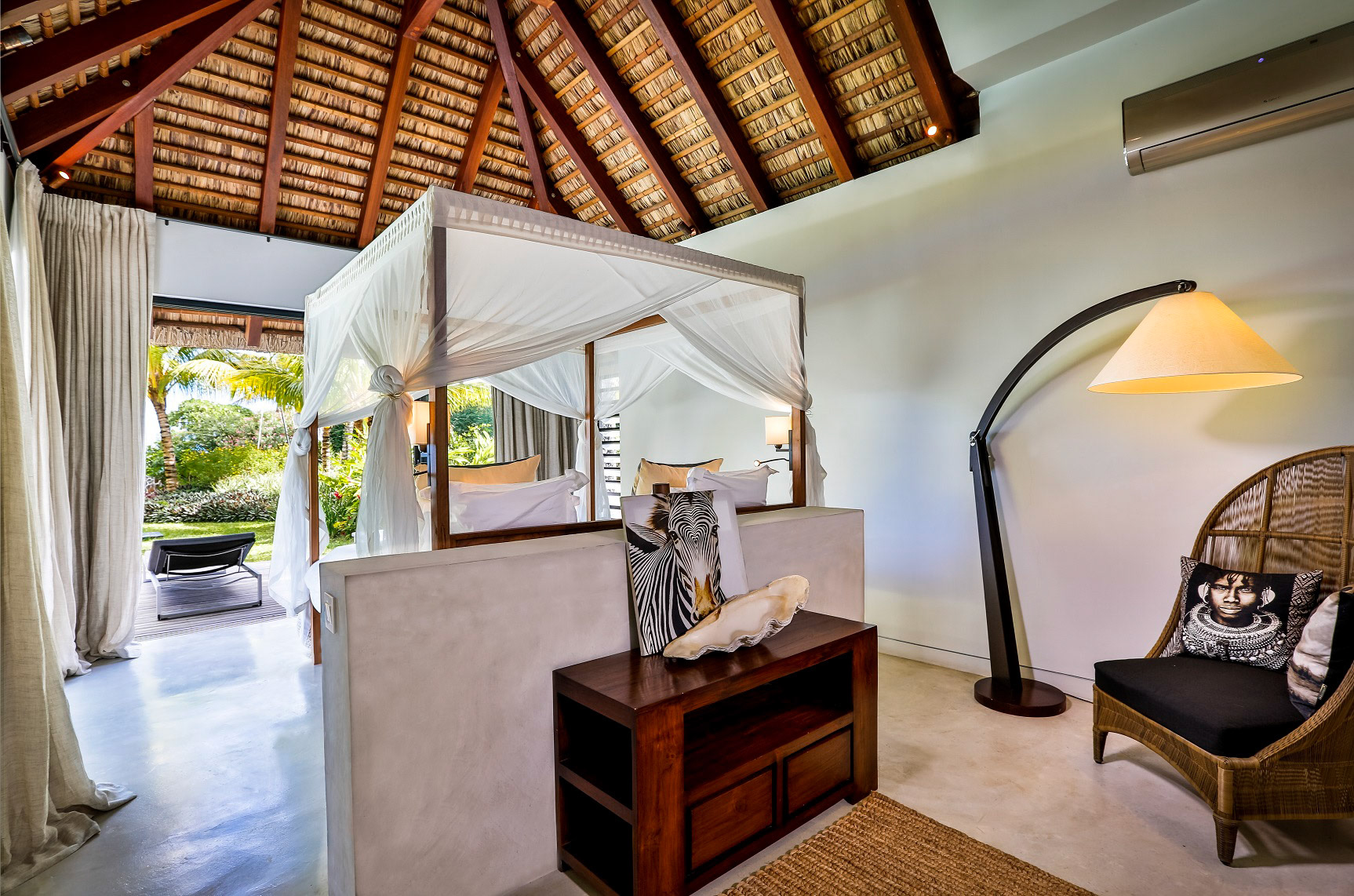 All three bedrooms have new air-conditioning units. The master bedroom adjoins the terrace and enjoys a view over the manicured gardens, and enjoys an ensuite bathroom with dual sinks, bath, and shower. The other two bedrooms (not pictured) share a bathroom and look over the back gardens.
