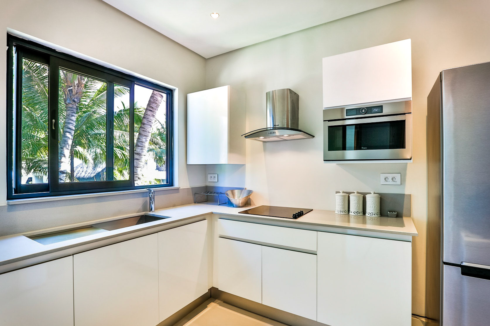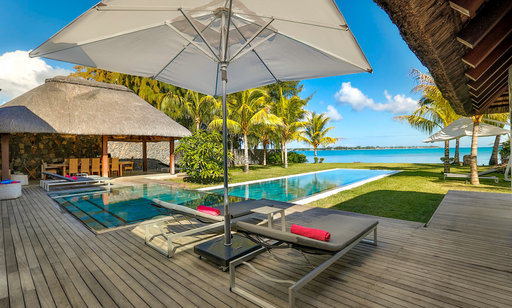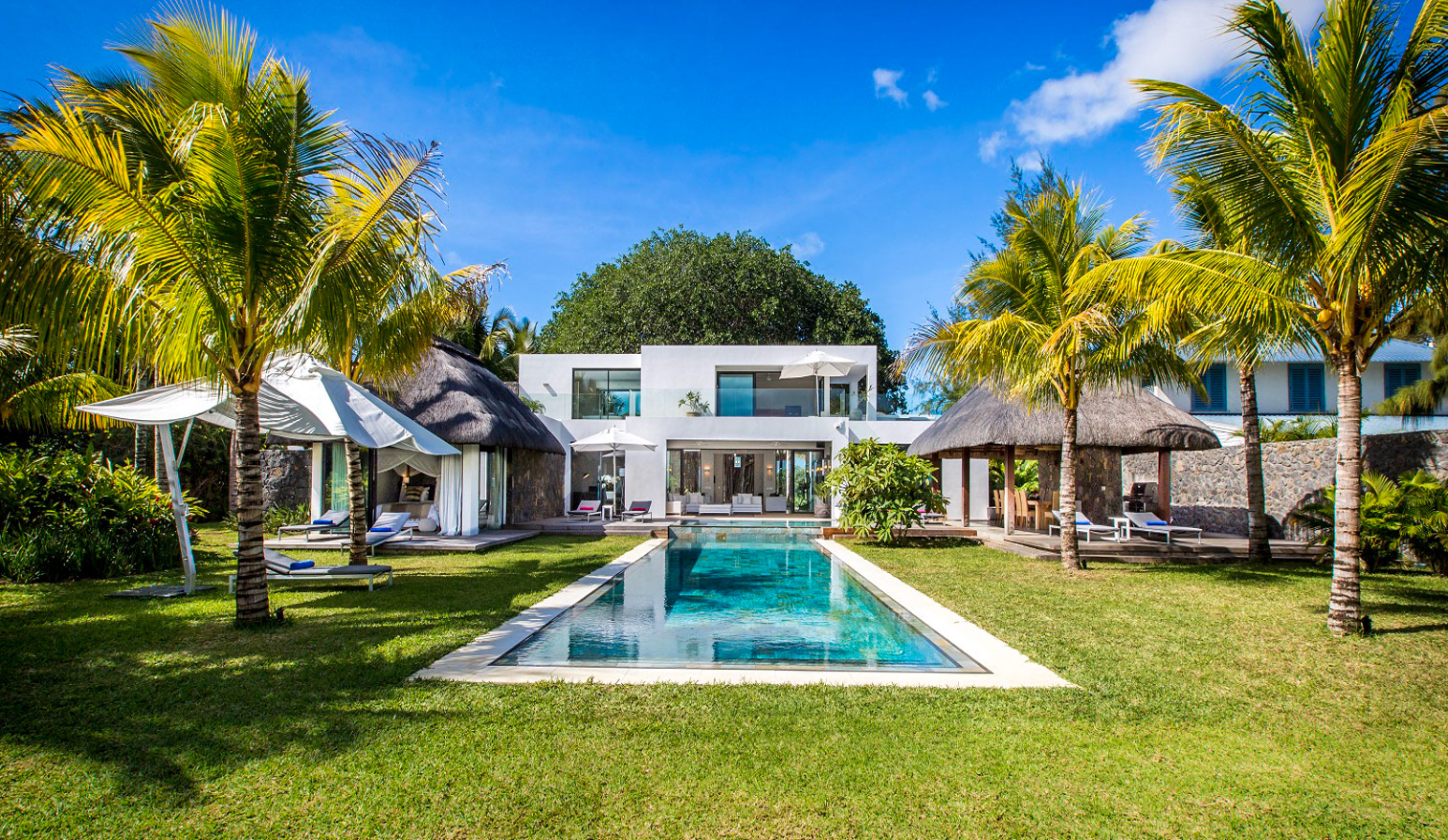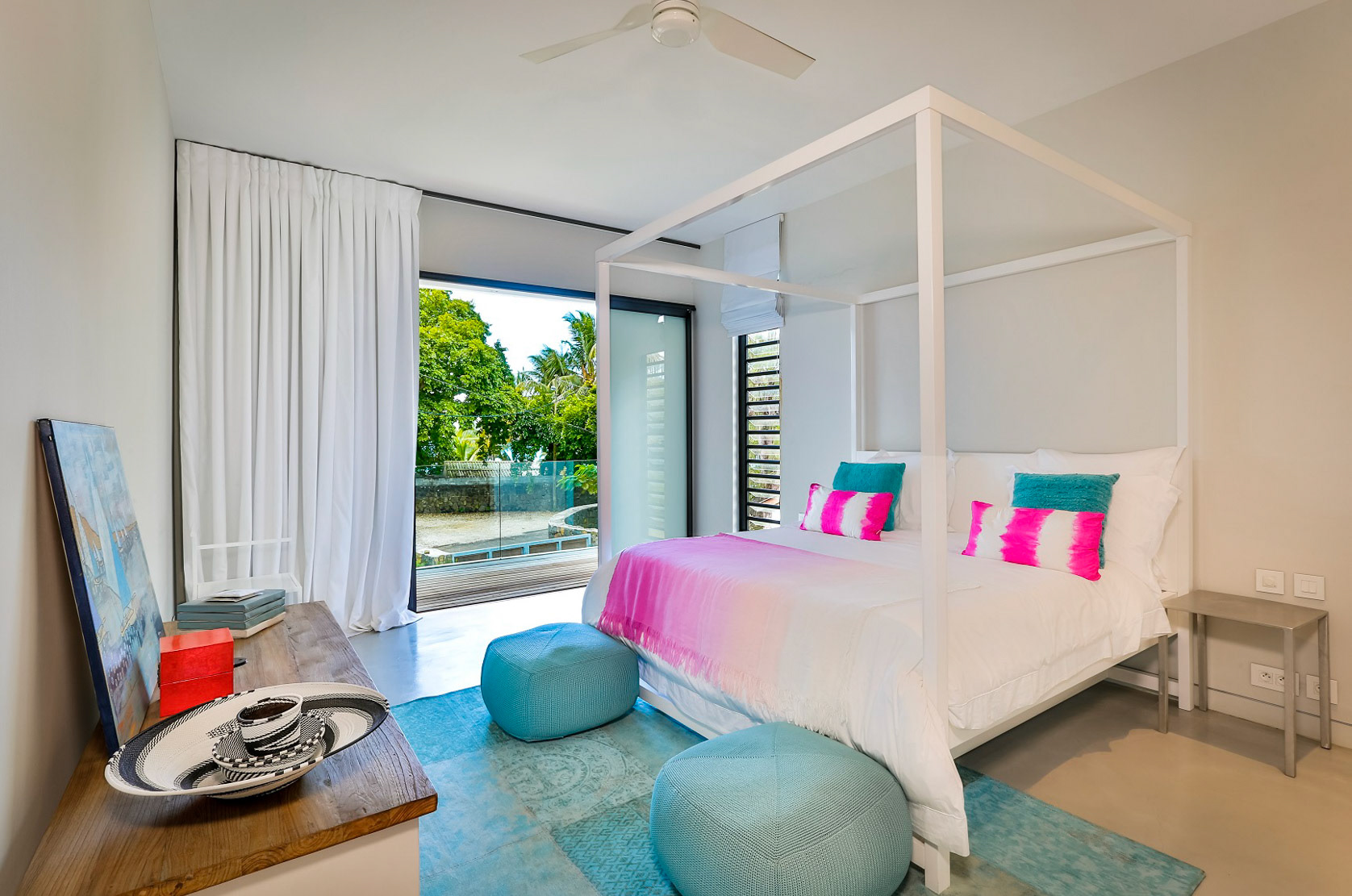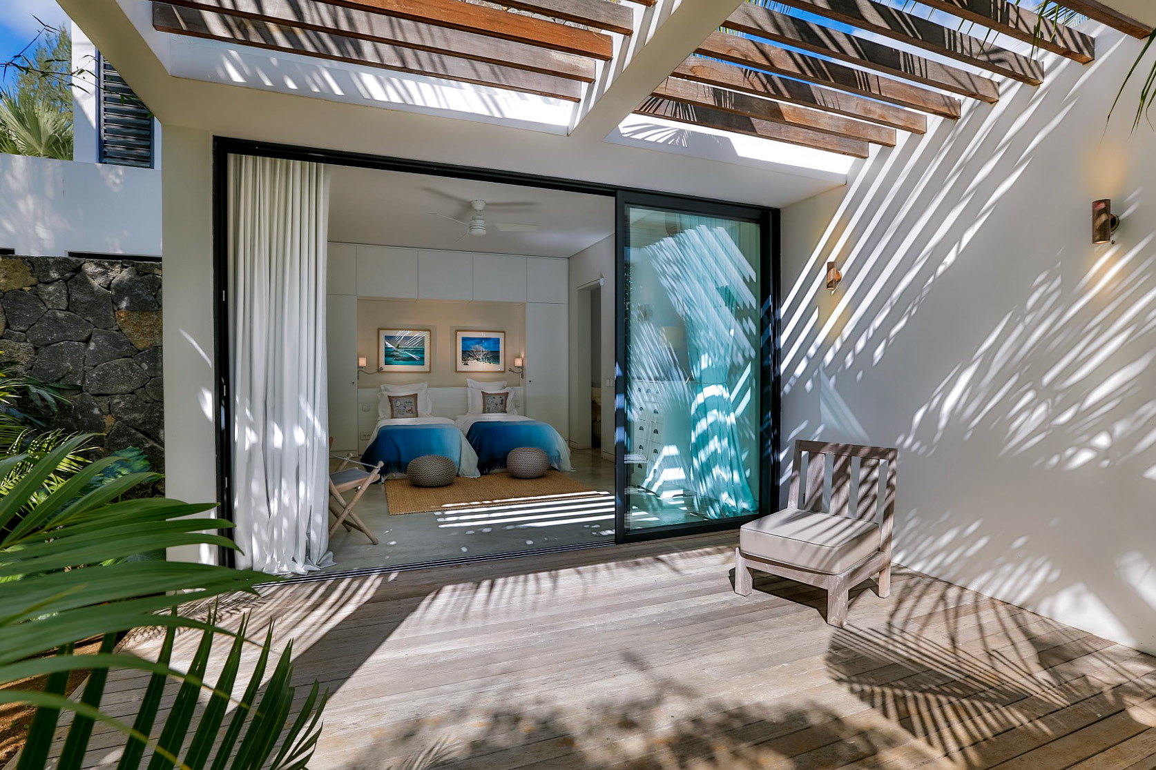 All three bedrooms have new air-conditioning units. The master bedroom adjoins the terrace and enjoys a view over the manicured gardens, and enjoys an ensuite bathroom with dual sinks, bath, and shower. The other two bedrooms (not pictured) share a bathroom and look over the back gardens.