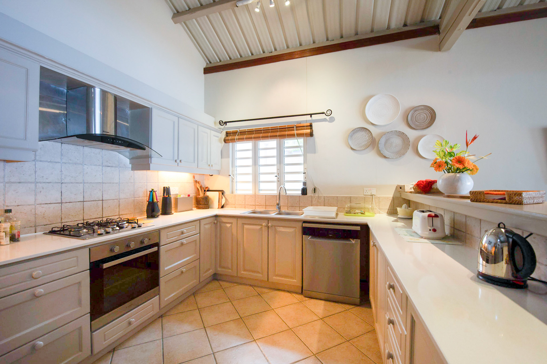 The kitchen is fully equipped with double door fridge, wine cellar, electric oven, gas cooker, dishwasher, microwave, toaster, coffee machine and all necessary mixers and utensils plus a barbecue for eight persons.