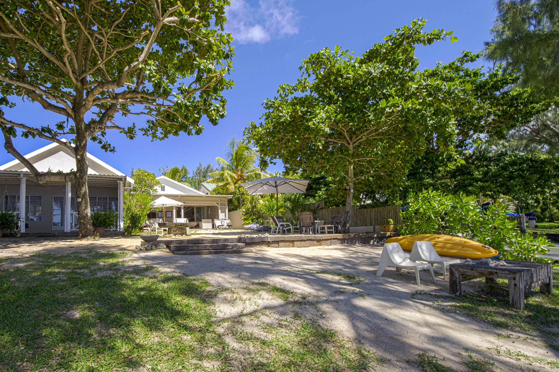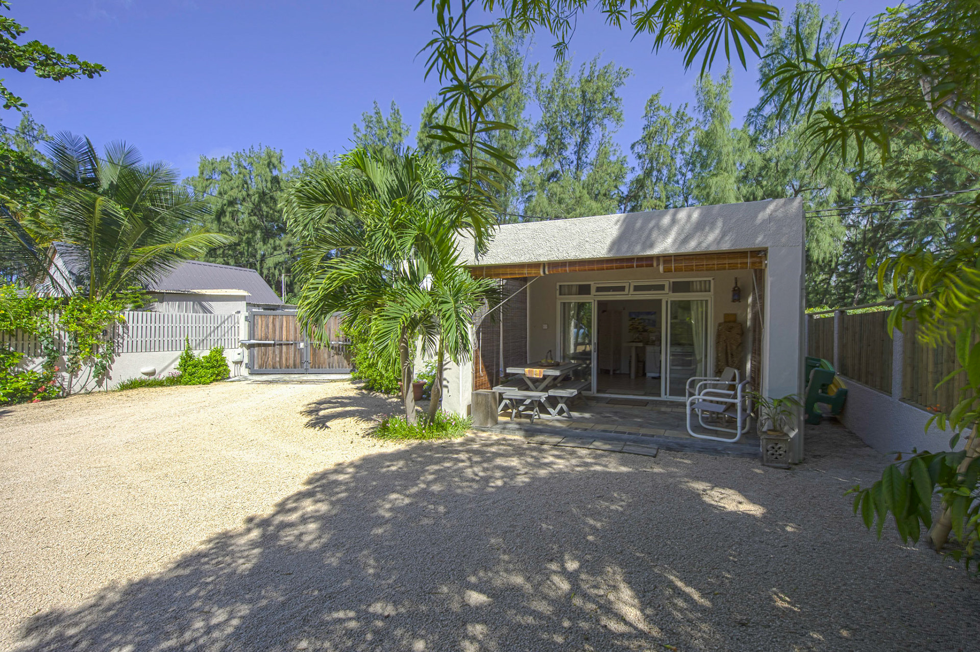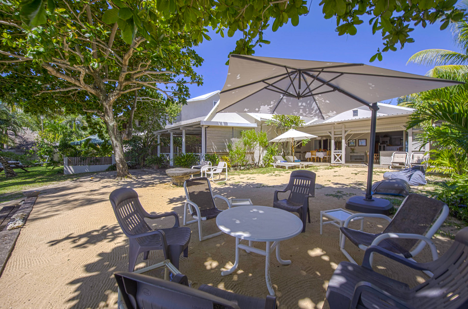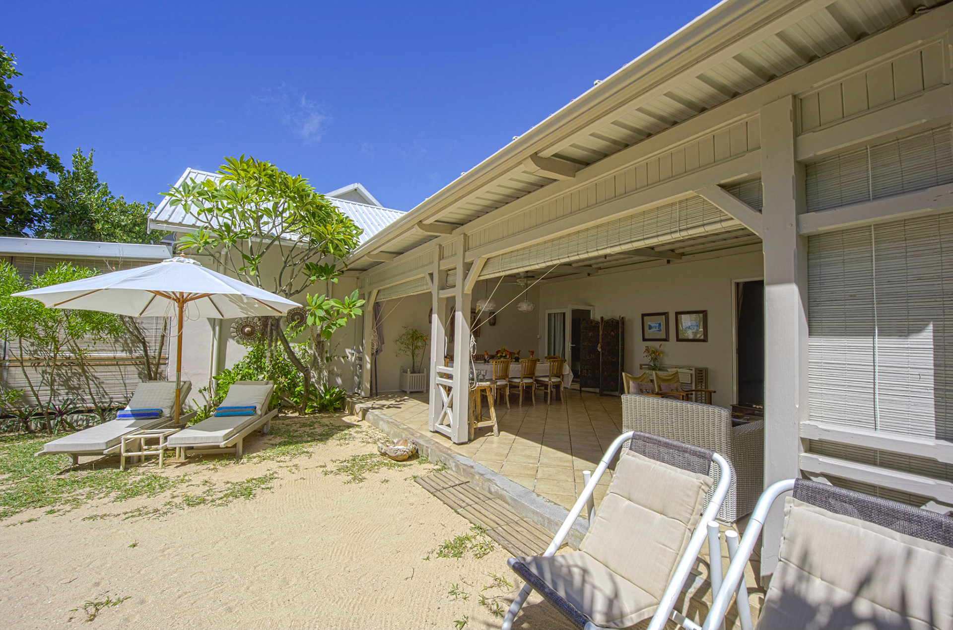 Outdoor wooden tables and chairs are available on the front terrace. Three large 4m sunshades are available on the beach in front of the pool, together with eight deck chairs that can also be used on the terrace.