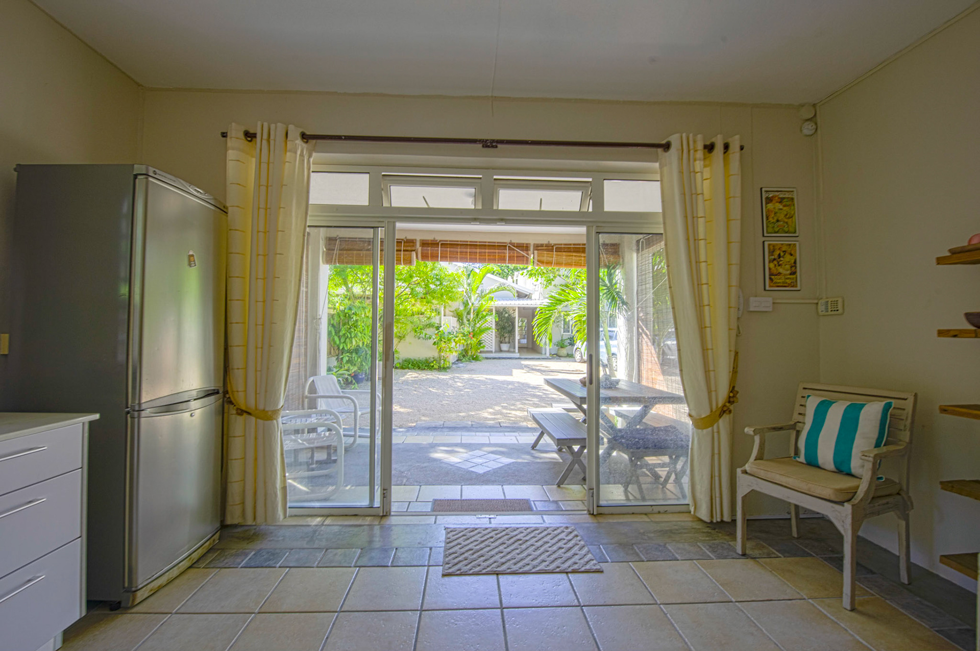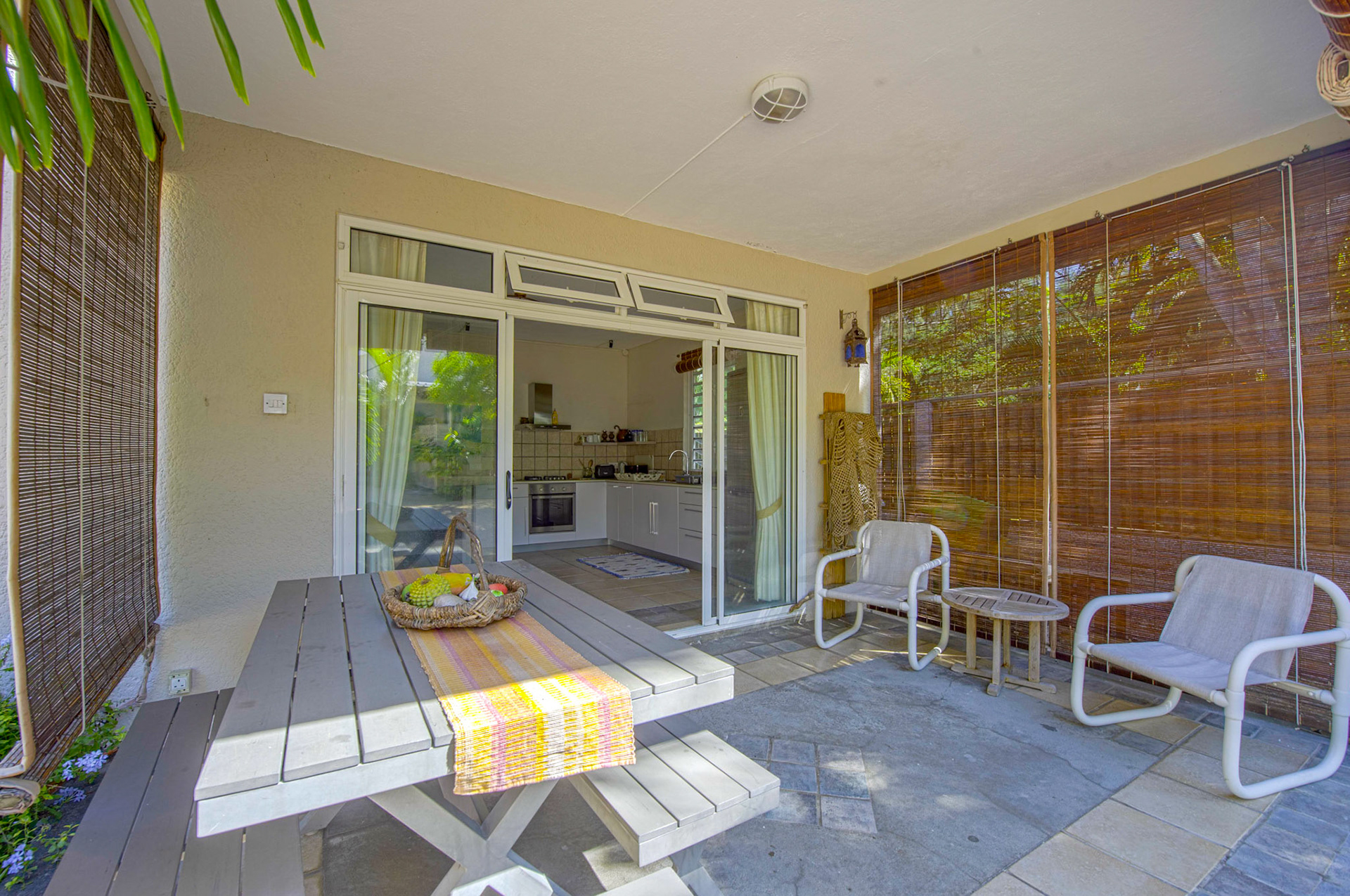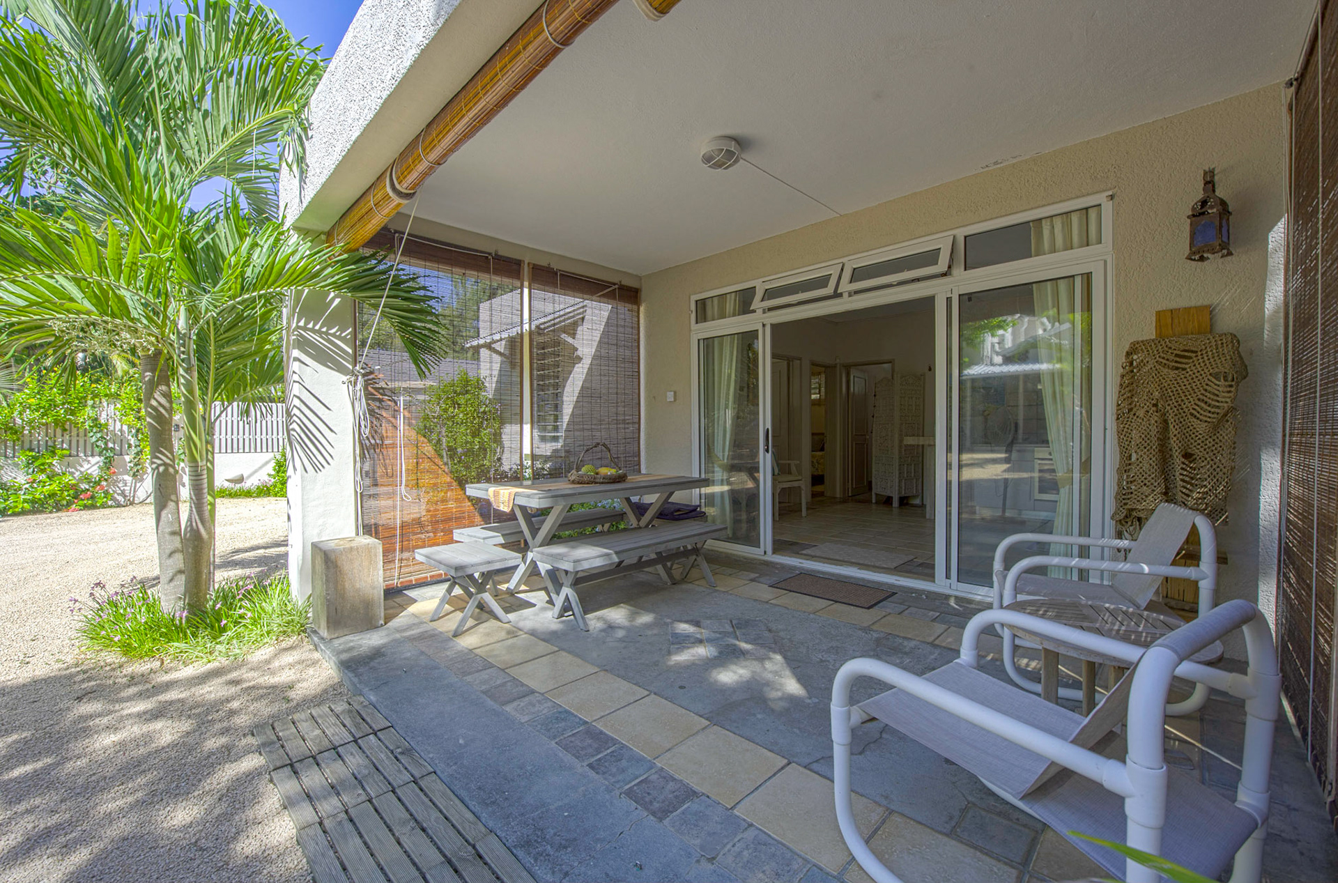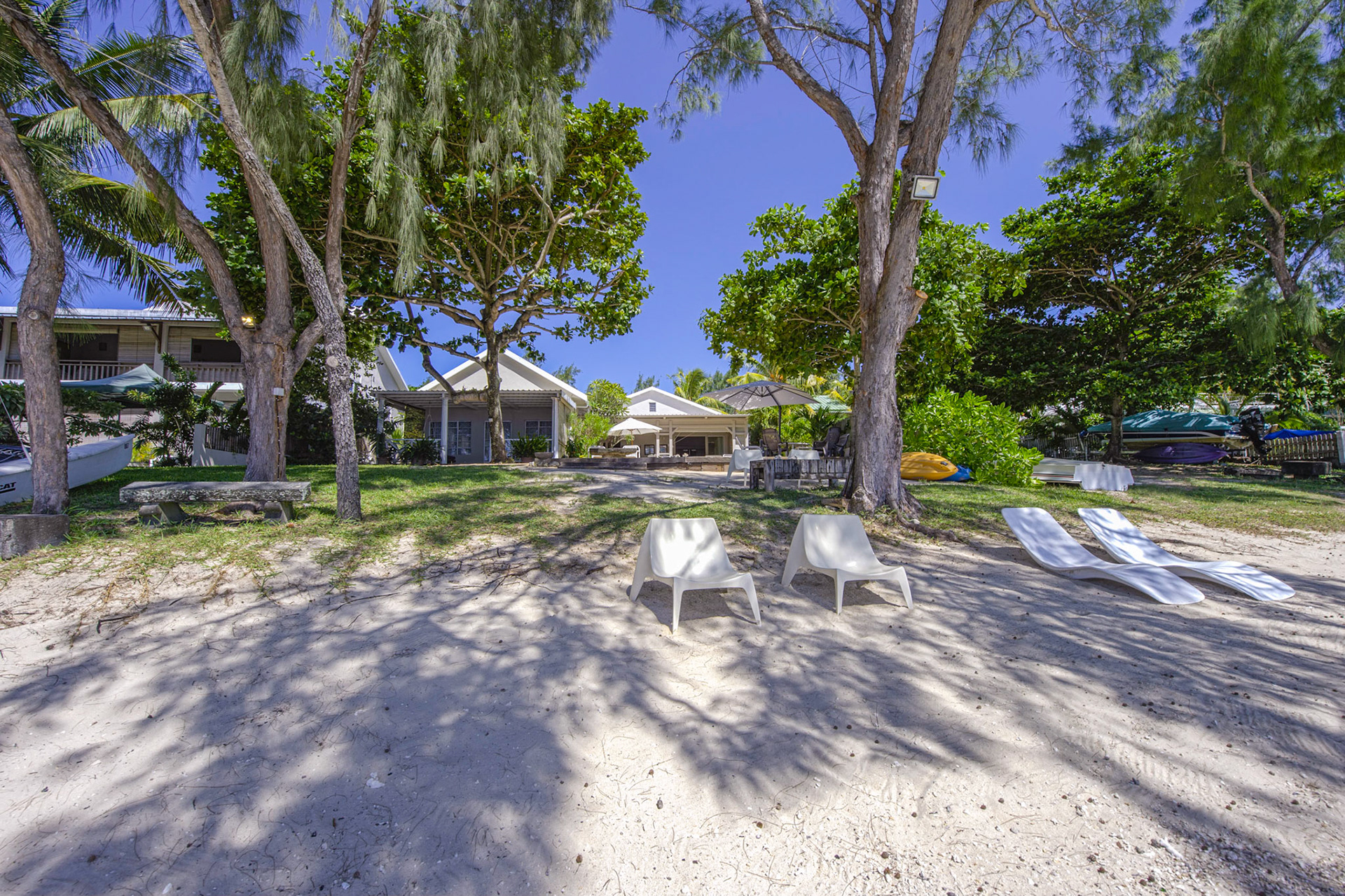 Outdoor wooden tables and chairs are available on the front terrace. Three large 4m sunshades are available on the beach in front of the pool, together with eight deck chairs that can also be used on the terrace.