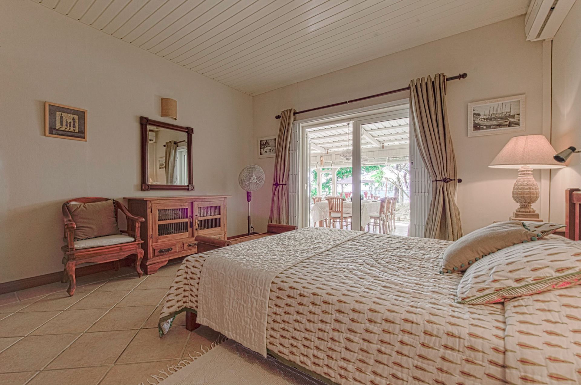 On the first floor the second bedroom (25sqm) with double bed 180 x 200, wardrobes, TV, DVD and mini bar plus an additional dressing, ensuite double bathroom with shower, hair dryer and independent toilet (18sqm) offers plenty of space and a magnificent view of the beach and lagoon.