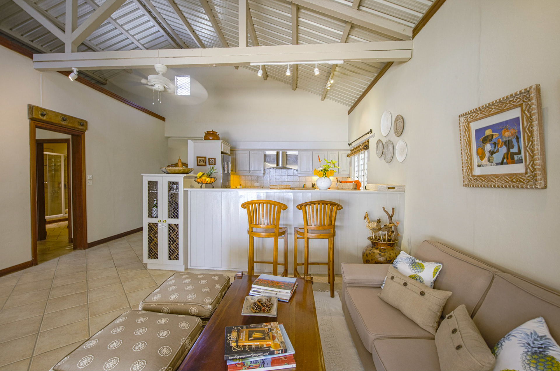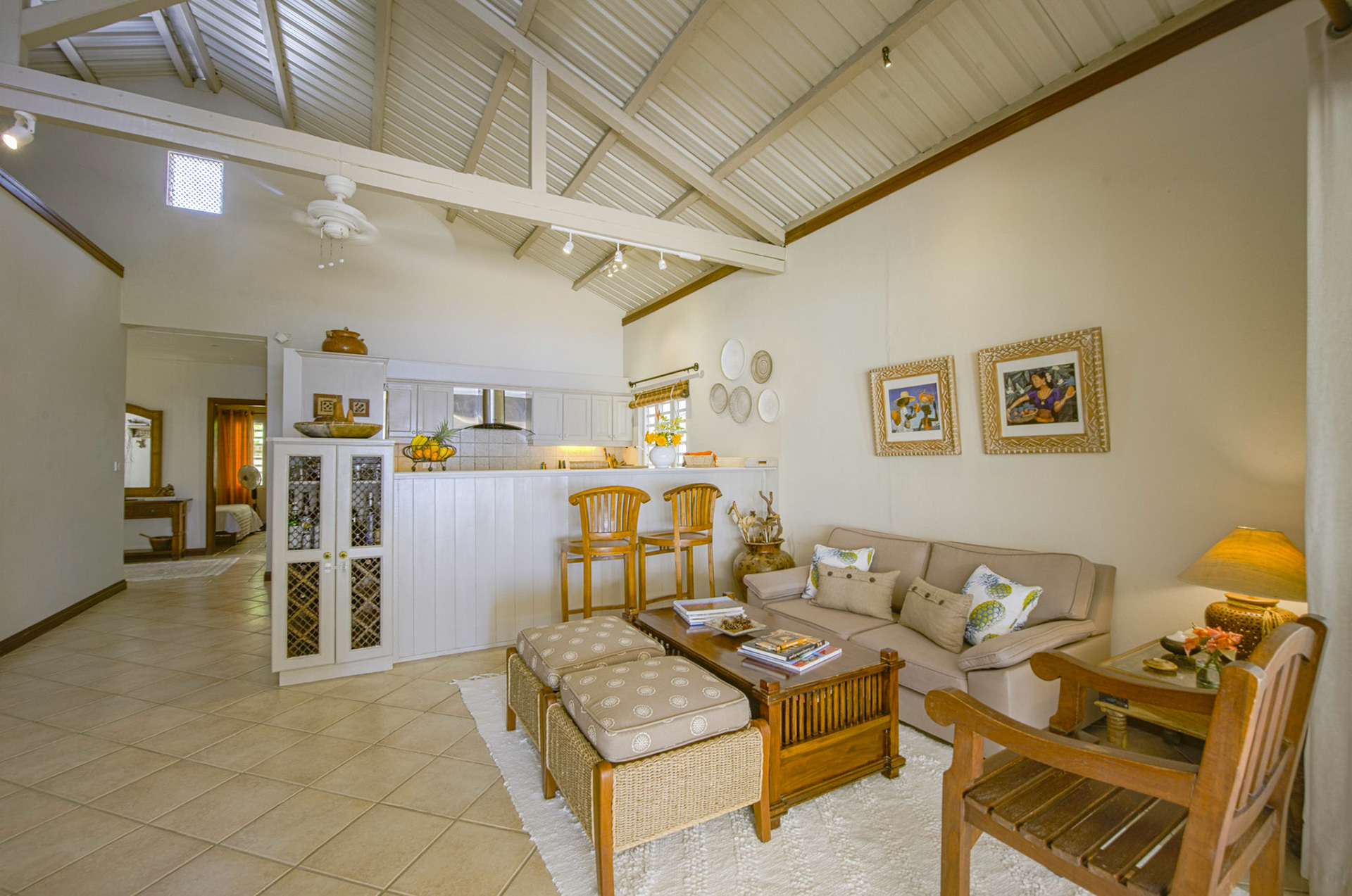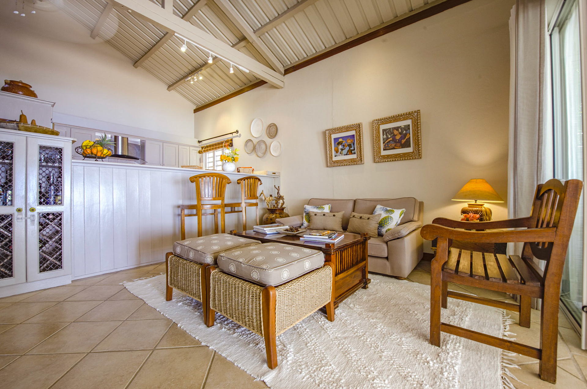 The living room (55sqm) features armchairs, sofas, chairs and lunch table for six persons, plus 32” flat screen LCD TV, DVD, and English and French satellite channels. Telephone and WiFi are available.