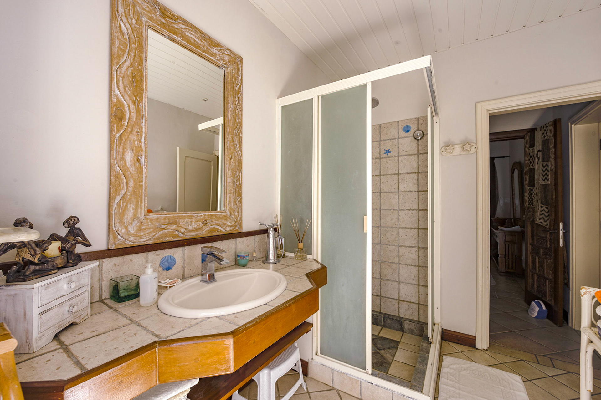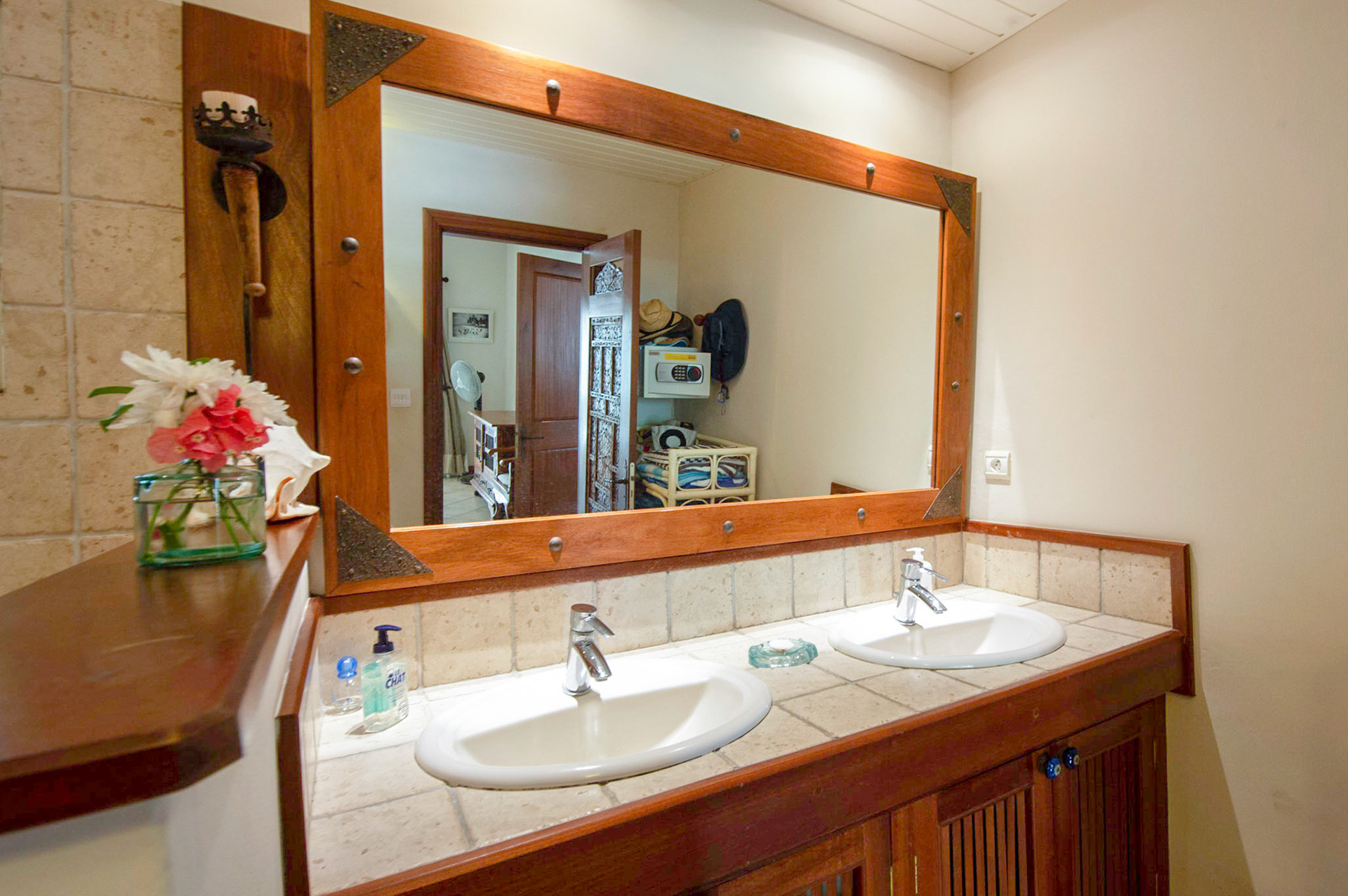 Bathroom 3: Italian quality tiling, double wash basins, shower 120 x100. Hair dryer available, towels and soap supplied