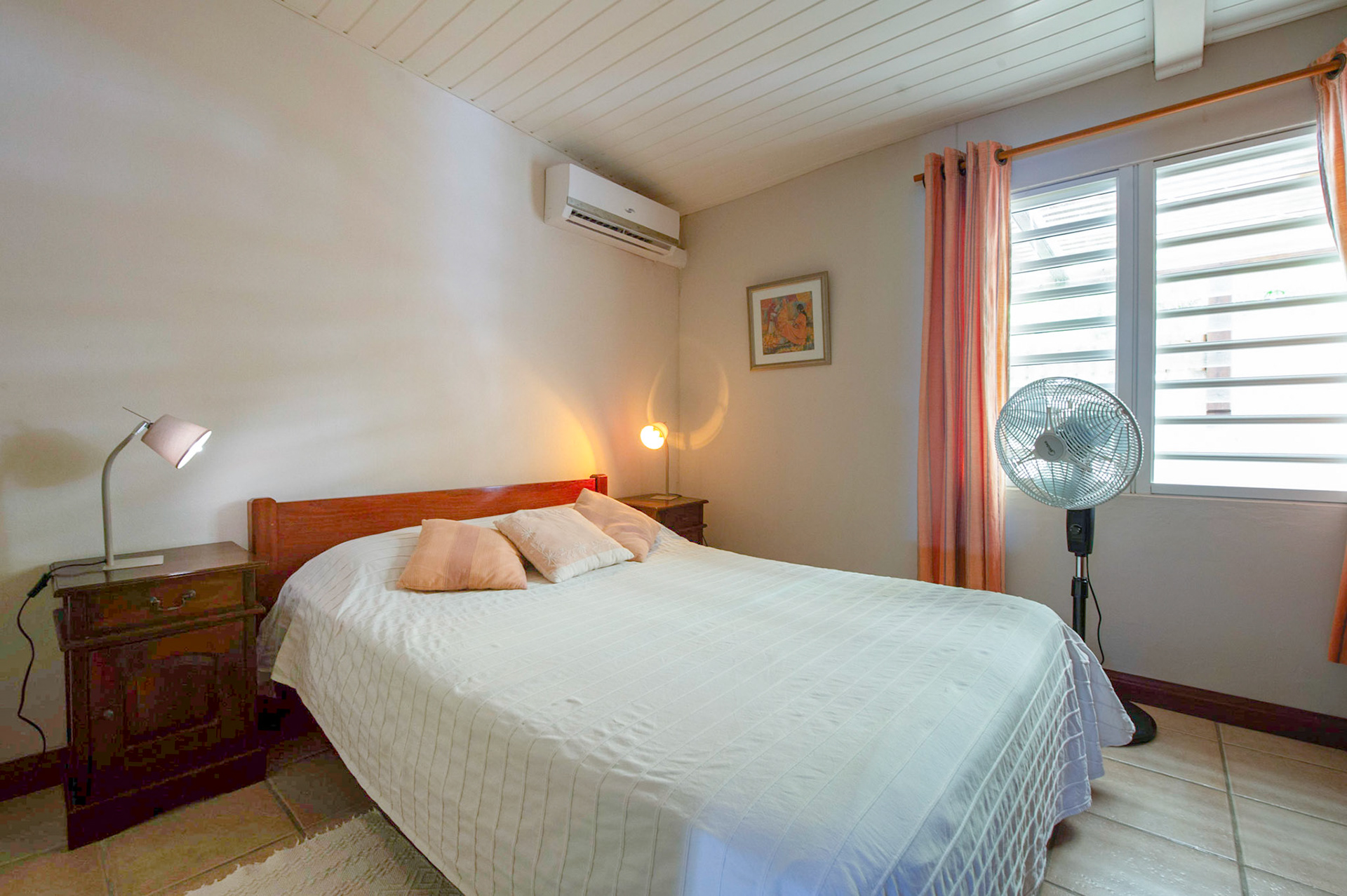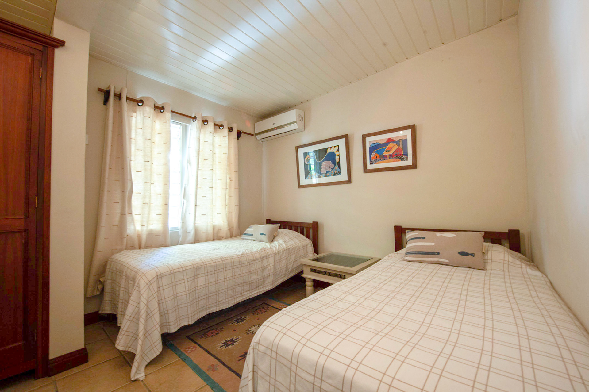 Childrens bedroom: First floor, pool and sea facing, 19 square metres plus mezzanine 10 square metres, four single beds 90 x 190, wardrobe, ensuite bathroom 10 square metres with double wash basin and toilet. Hair dryer available, towels and soap supplied.