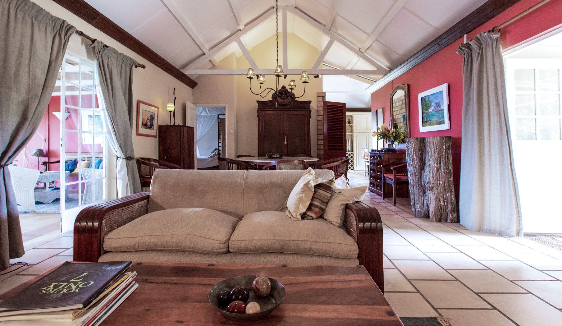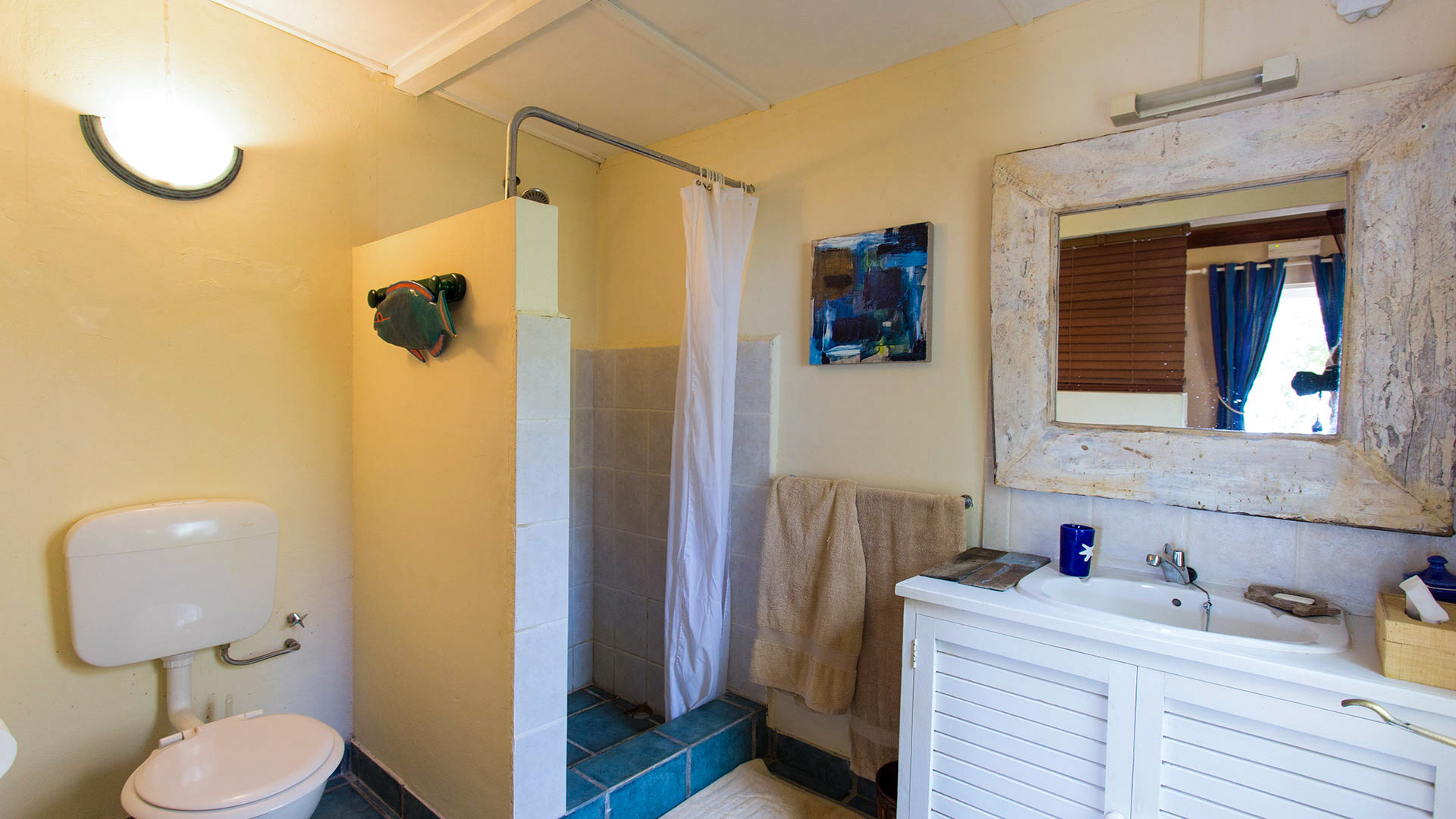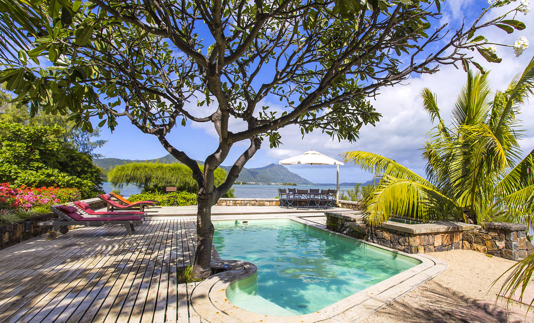 Lovely and comfortable beach villa at Îlot Fortier, 5 bedrooms and 5 bathrooms, swimming pool and beautiful views, unique location. The villa is located at Îlot Fortier, on the road between Rivière Noire and Le Morne. It takes its name from the pass of Harmony which separates its lagoon from the sea. Magnificent view over the lagoon and the mountain of Le Morne. A boat accommodating 10 people (including the skipper) is at available on high tide days for Rs 1,000 (€ 25) per trip (payable directly to Denis, the gardener and skipper). Indoors 3 bedrooms are part of the main house and the other ones are detached in an independent pavilion including a fare (wooden house on stilts, not air conditioned) Living room: sitting area for 8 guests, table for 8 guests Fully equipped kitchen: gas stove, hood, gas oven, American fridge, filter coffee maker, kettle, toaster, dishwasher, microwave, water filter. Laundry room: washing machine Bedroom 1 (African Room): sea view - private terrace, air conditioning + fan, double bed 1m80 x 2m, dressing room, ensuite shower room: 1 shower, 2 washbasins, 1 WC, 1 open shower. Bedroom 2 (Indian Room): air conditioning + fan, double bed 1m80 x 2m, ensuite shower room: 1 shower, 2 washbasins, 1 WC Bedroom 3 (Chinese Room): sea view - private terrace, air conditioning, 2 beds 1m60 x 2m, bathroom In the pavilion (Fare) : Small wooden house located next to the swimming pool. Sea view - private terrace + outside bathroom. Fan only, double bed 1m80 x 2m. Ensuite bathroom: 1 WC + 1 washbasin inside + 1 shower. Equipement : • A safe • TV - satellite (Canal Sat) / DVD • Linens and towels provided • Internet 50G included. Additional GB require buying a recharge card at the supermarket 10 minutes from the house. Outdoors • Swimming pool area: deckchairs + umbrella, Balinese kiosk, table for 8 guests • Terrace (verandah) front (sea side): sitting area and table for 10 guests
