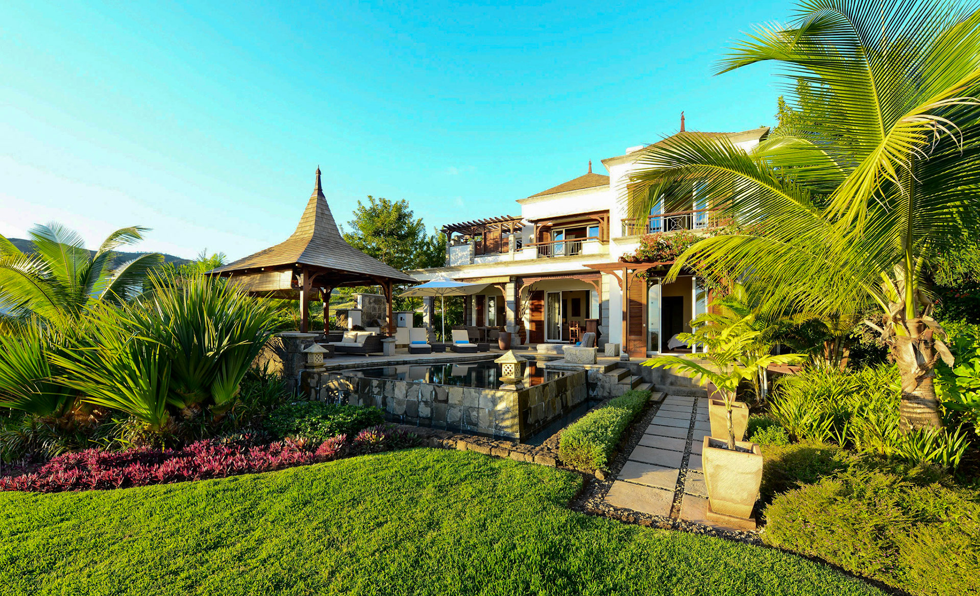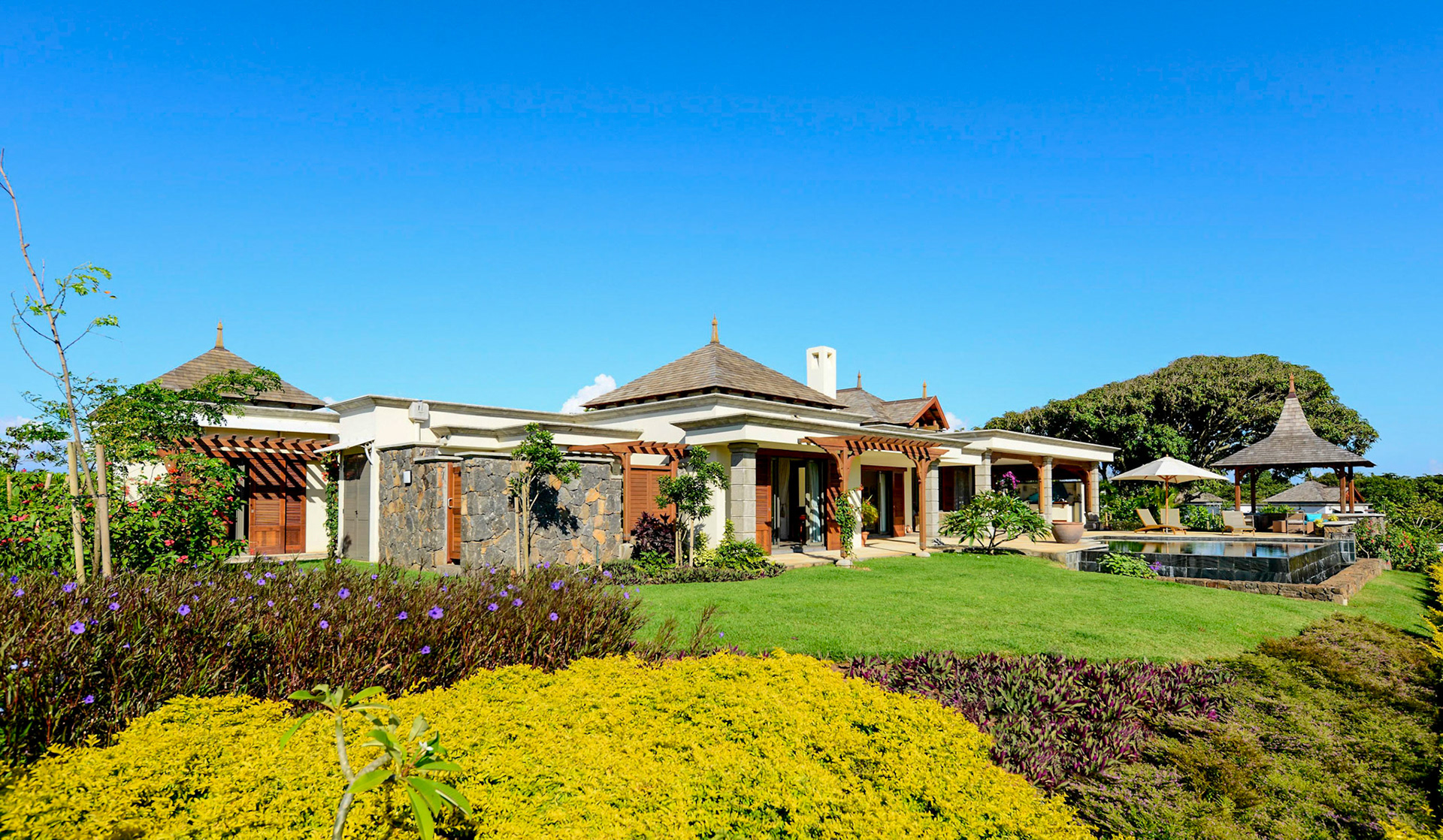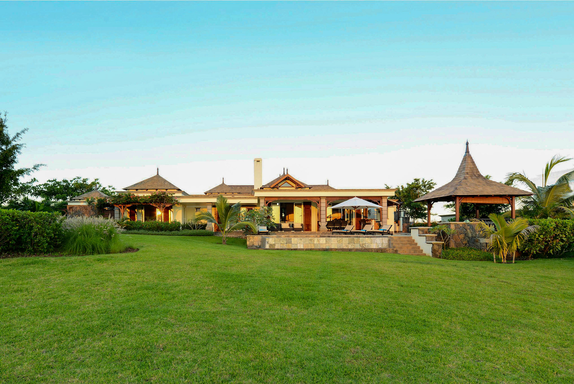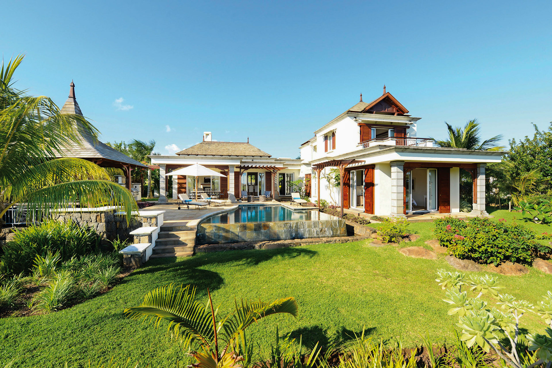 Magnificent villa located on the West Coast of Mauritius in the luxury golf estate, 5 bedrooms with bathrooms, private pool, large garden with bar, petanque, fitness room