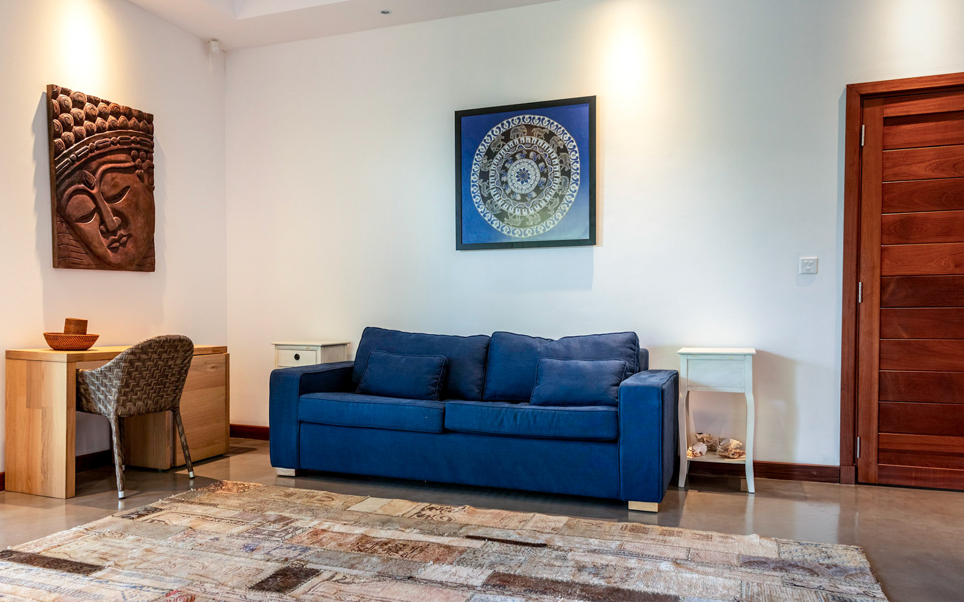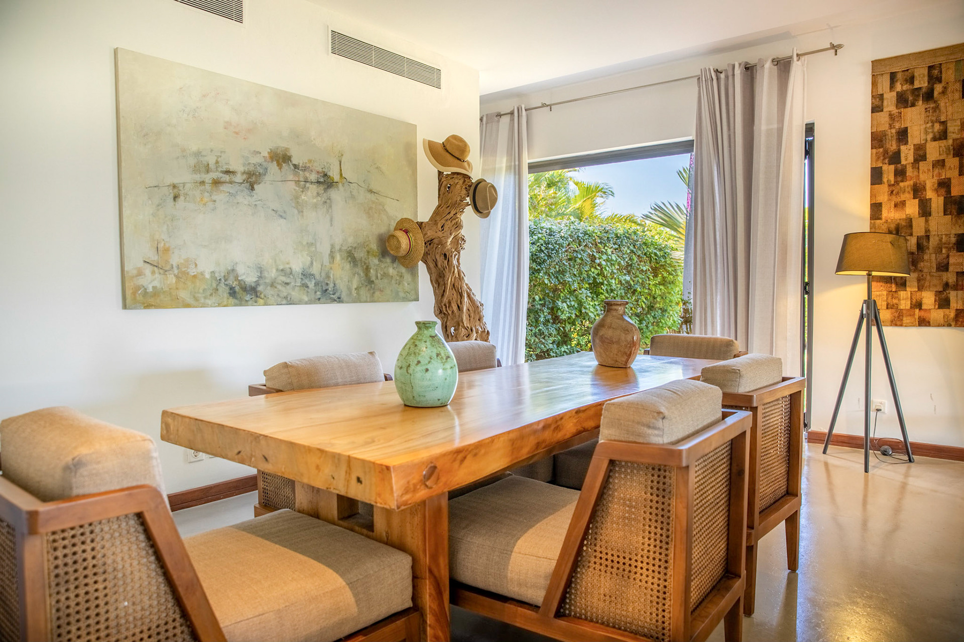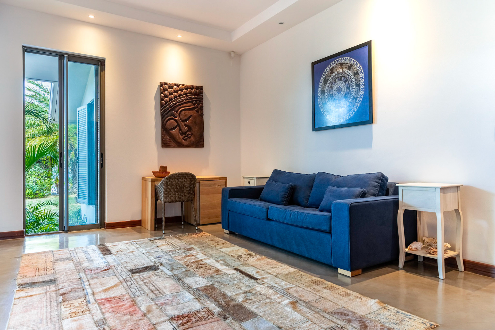 The living room (55sqm) features armchairs, sofas, chairs and lunch table for six persons, plus 32” flat screen LCD TV, DVD, and English and French satellite channels. Telephone and WiFi are available.