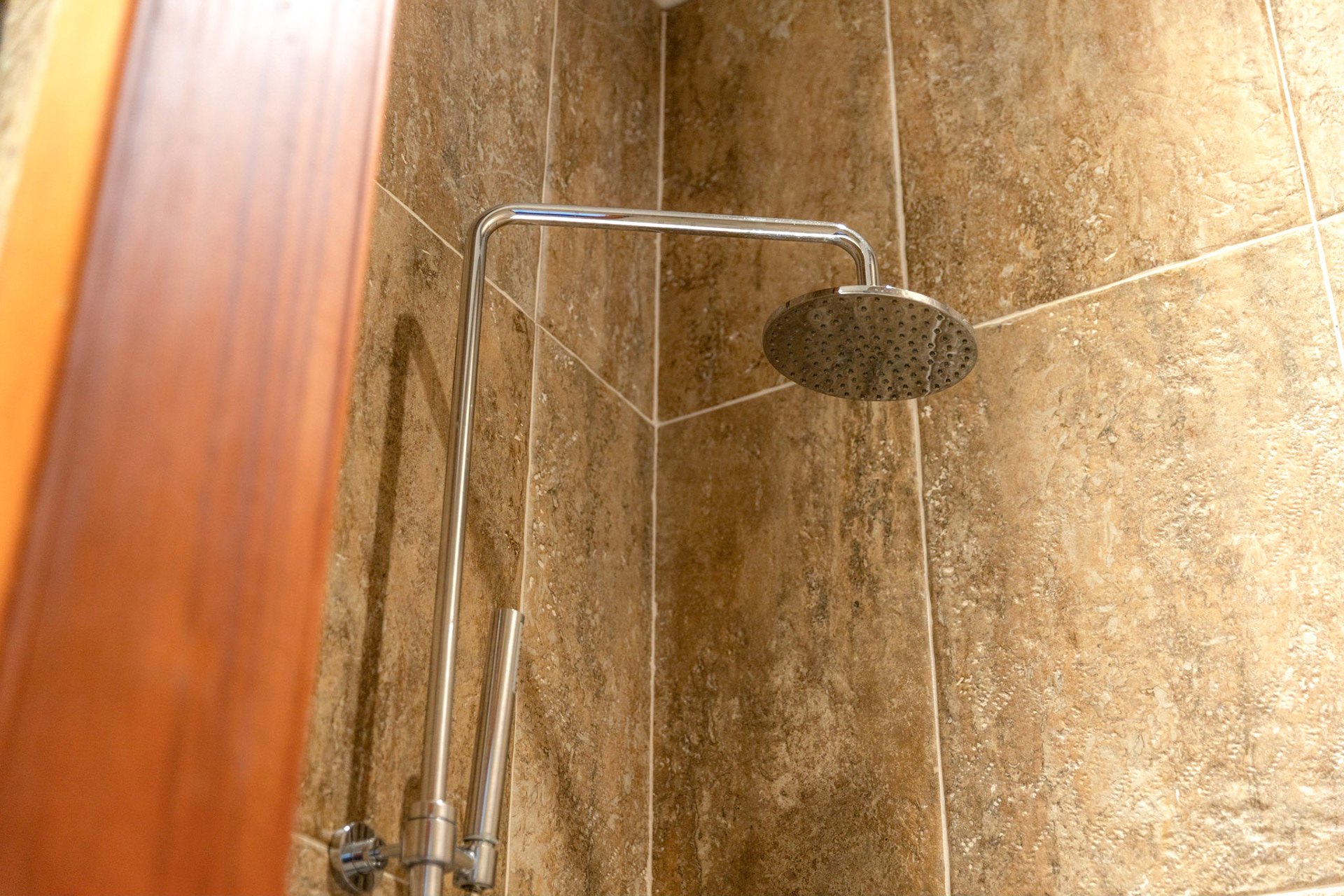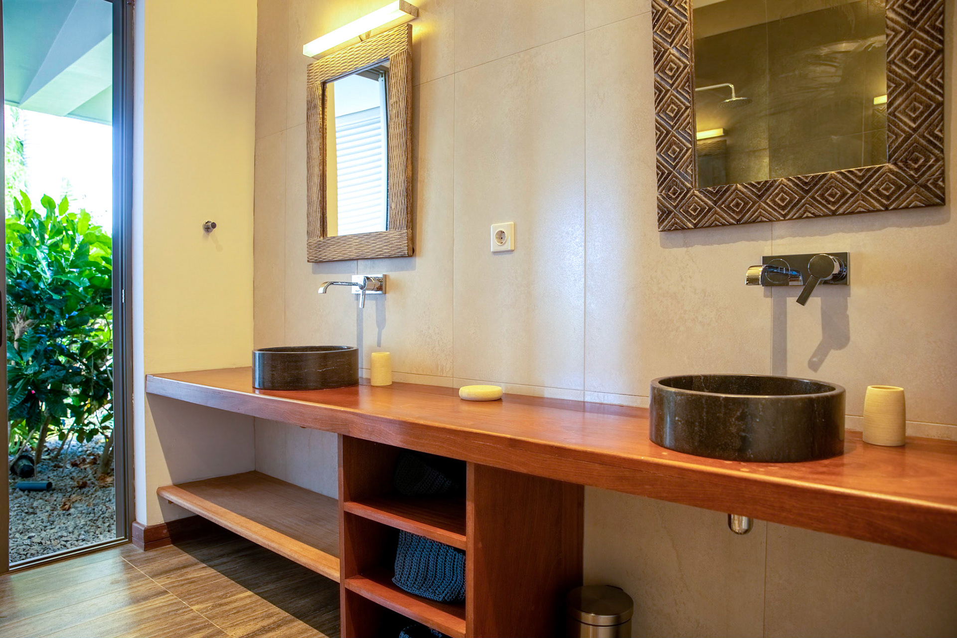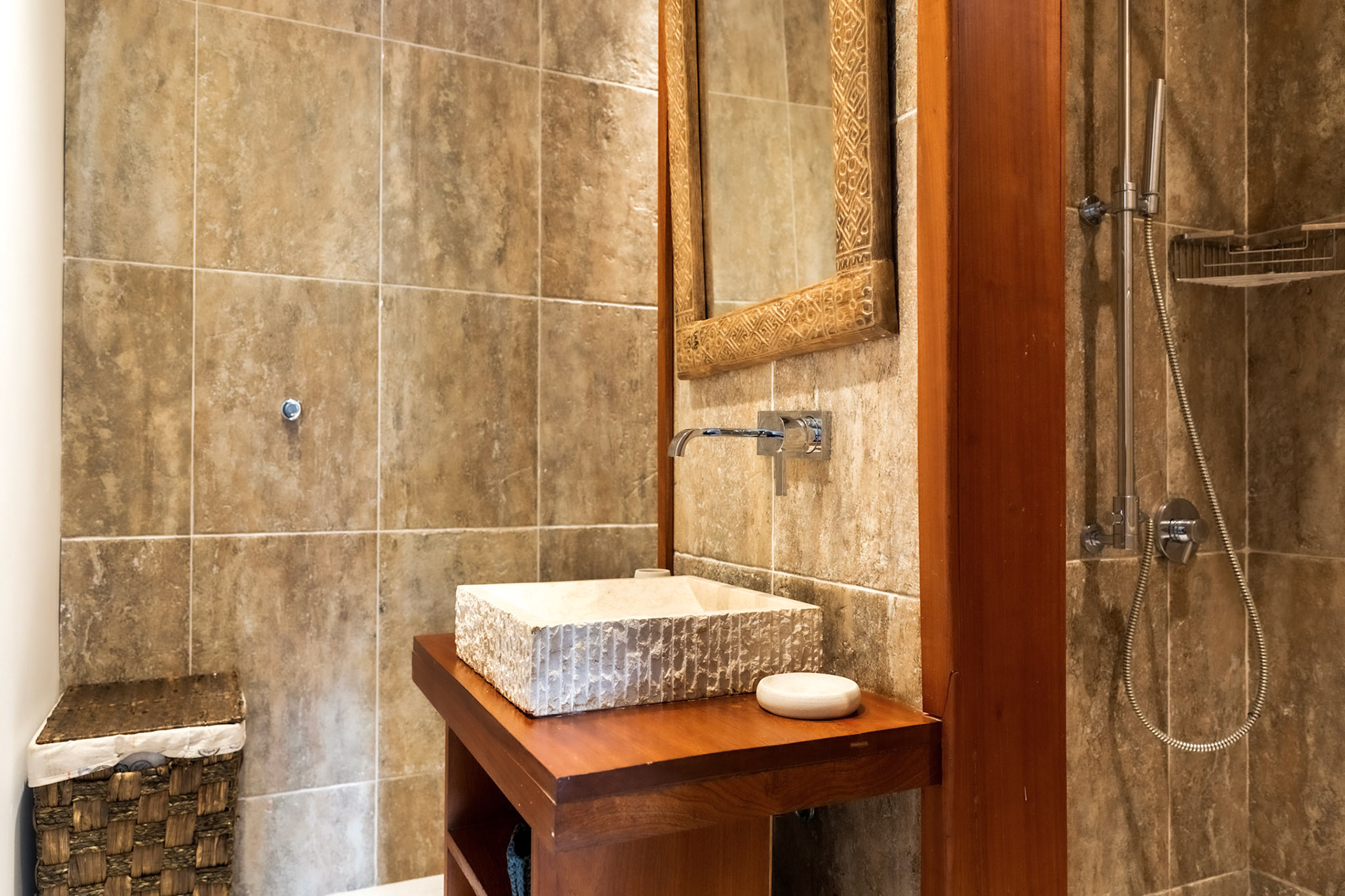 Bathroom 3: Italian quality tiling, double wash basins, shower 120 x100. Hair dryer available, towels and soap supplied