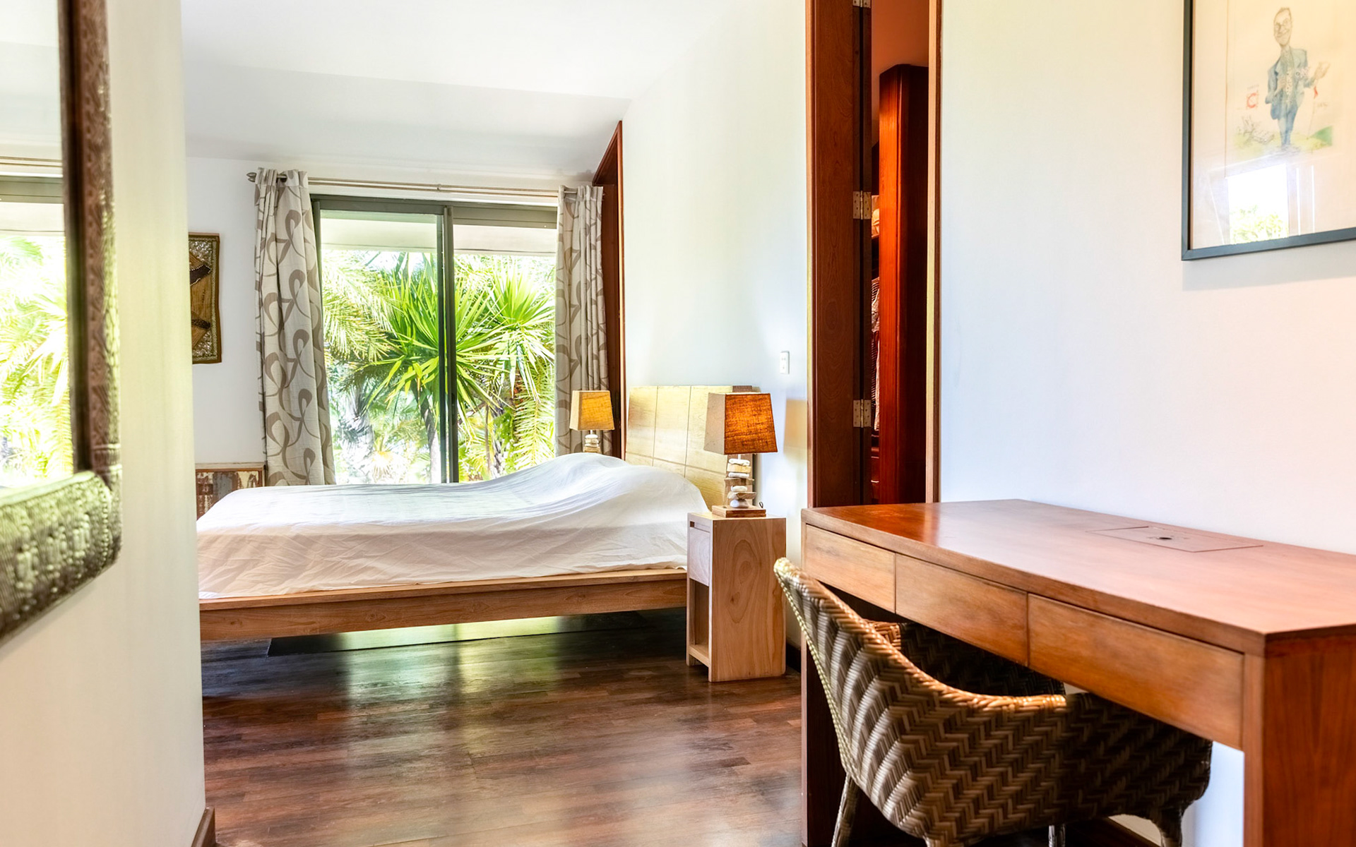 Master bedroom 2: First floor, pool and sea facing 25 square metres, balcony, double bed 1.90m x 2m, mini bar, LED TV + Blu Ray DVD, with double wardrobe, plus independent dressing, ensuite bathroom with two wash basins and large shower. Independent toilet.