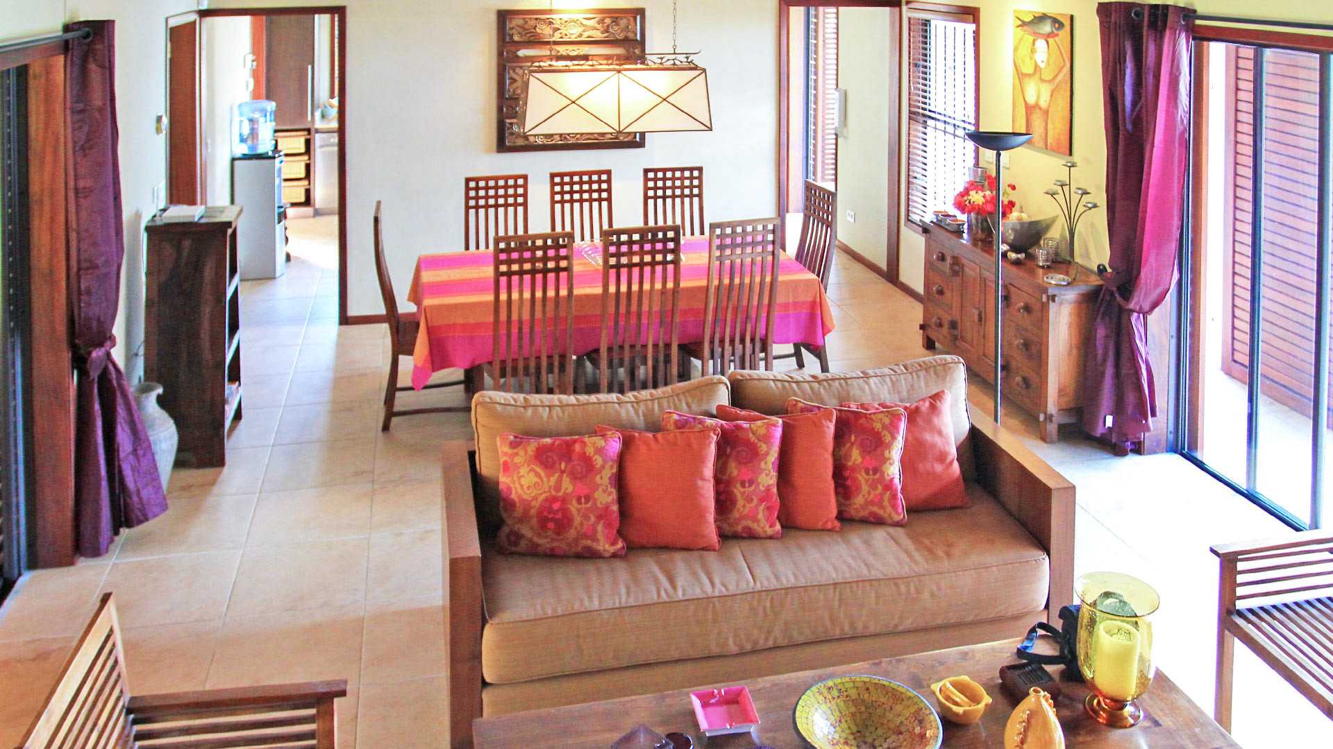 The large open living room offers you a peaceful and spectacular view over the ocean. You have several long couchs, perfect for you to gather all together. There is a TV lounge, for more tranquility.