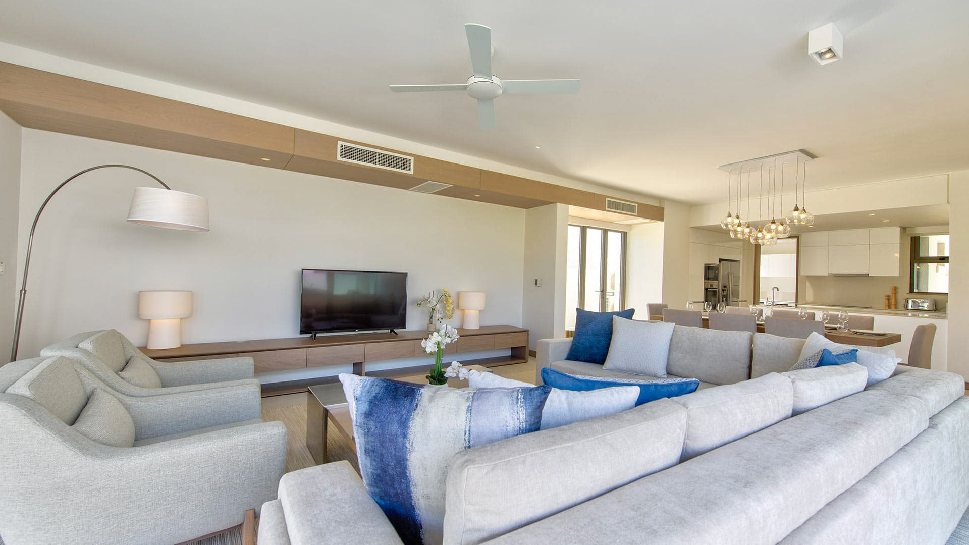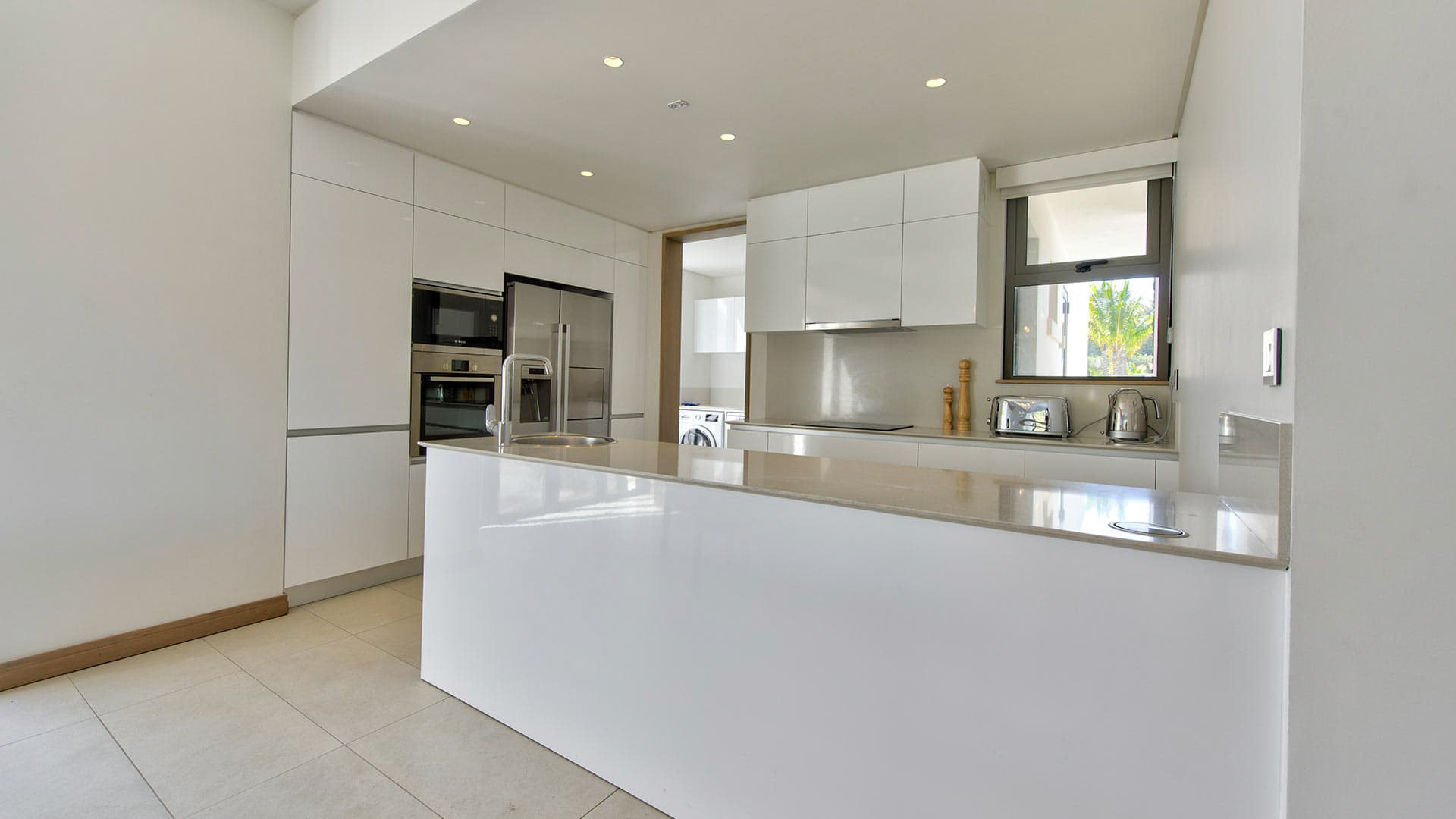 The living areas are composed of one large open style kitchen, fully equipped, with access to a living room with a TV and to the terrace/