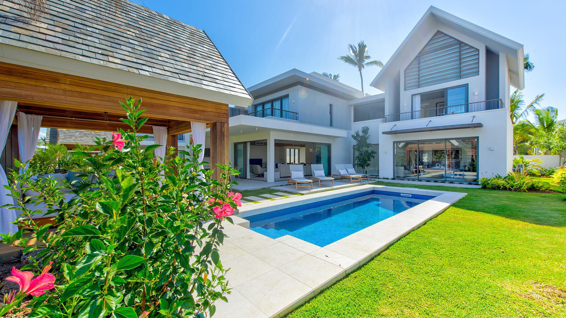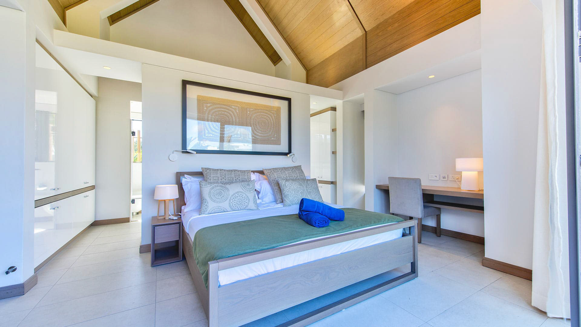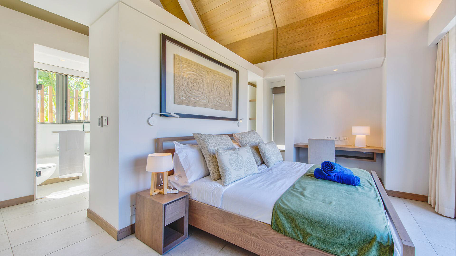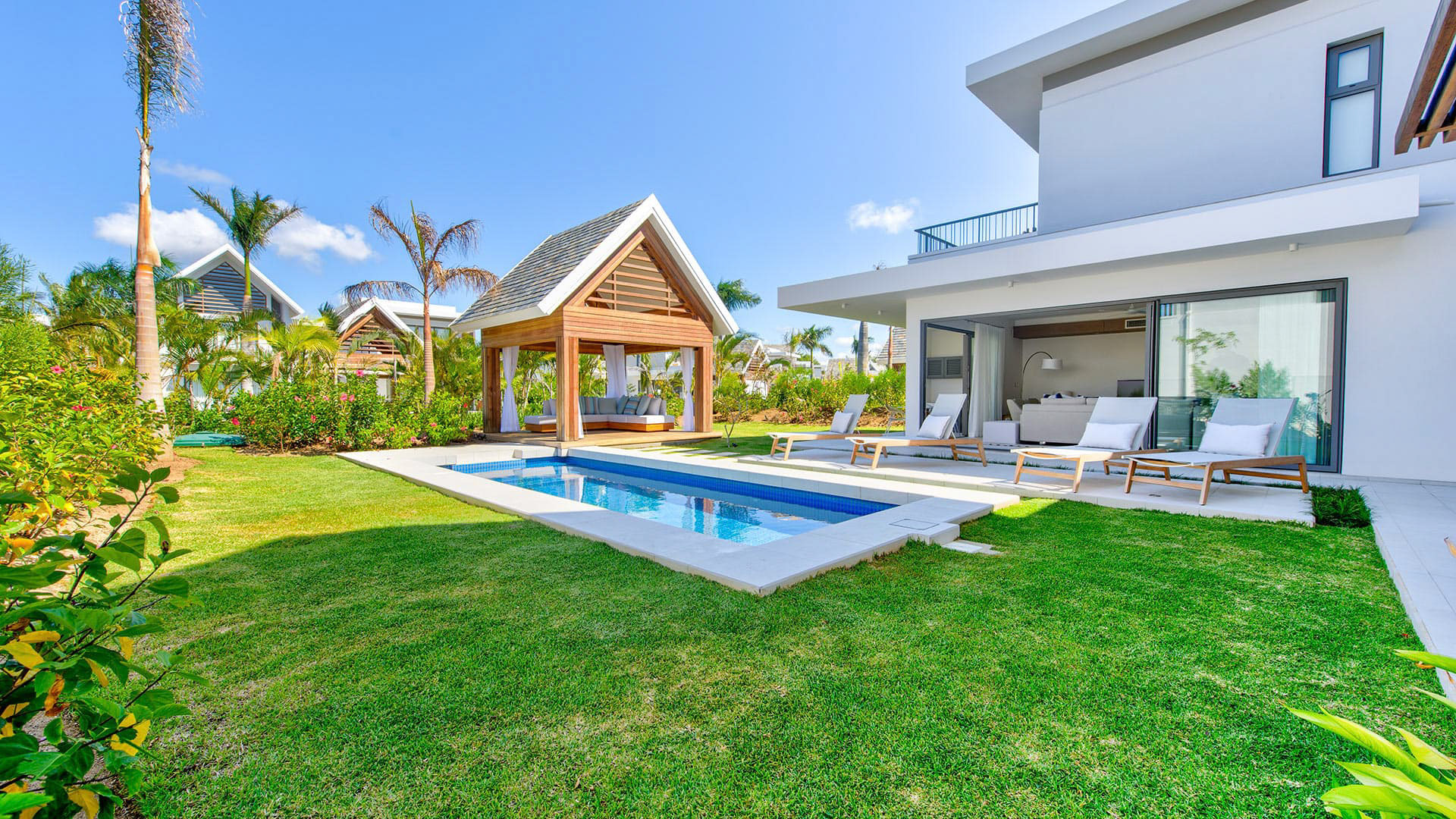 This 180m² Balinese inspired villa is located opposite to the Wolmar estate, on the West coast of Mauritius. Wolmar is a natural reserve of 600 hectares, home to more than 2,500 deer, wild boars, rabbits and monkeys.