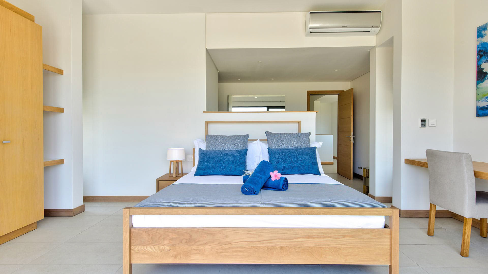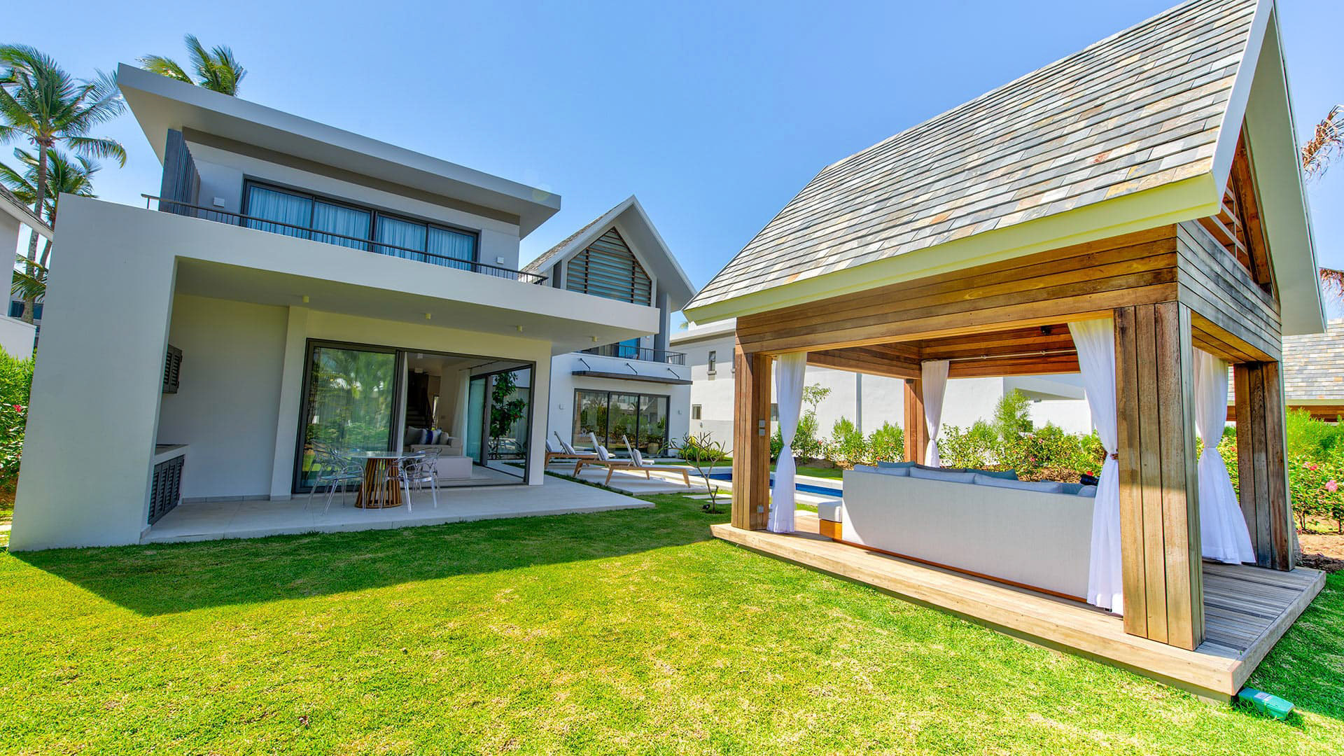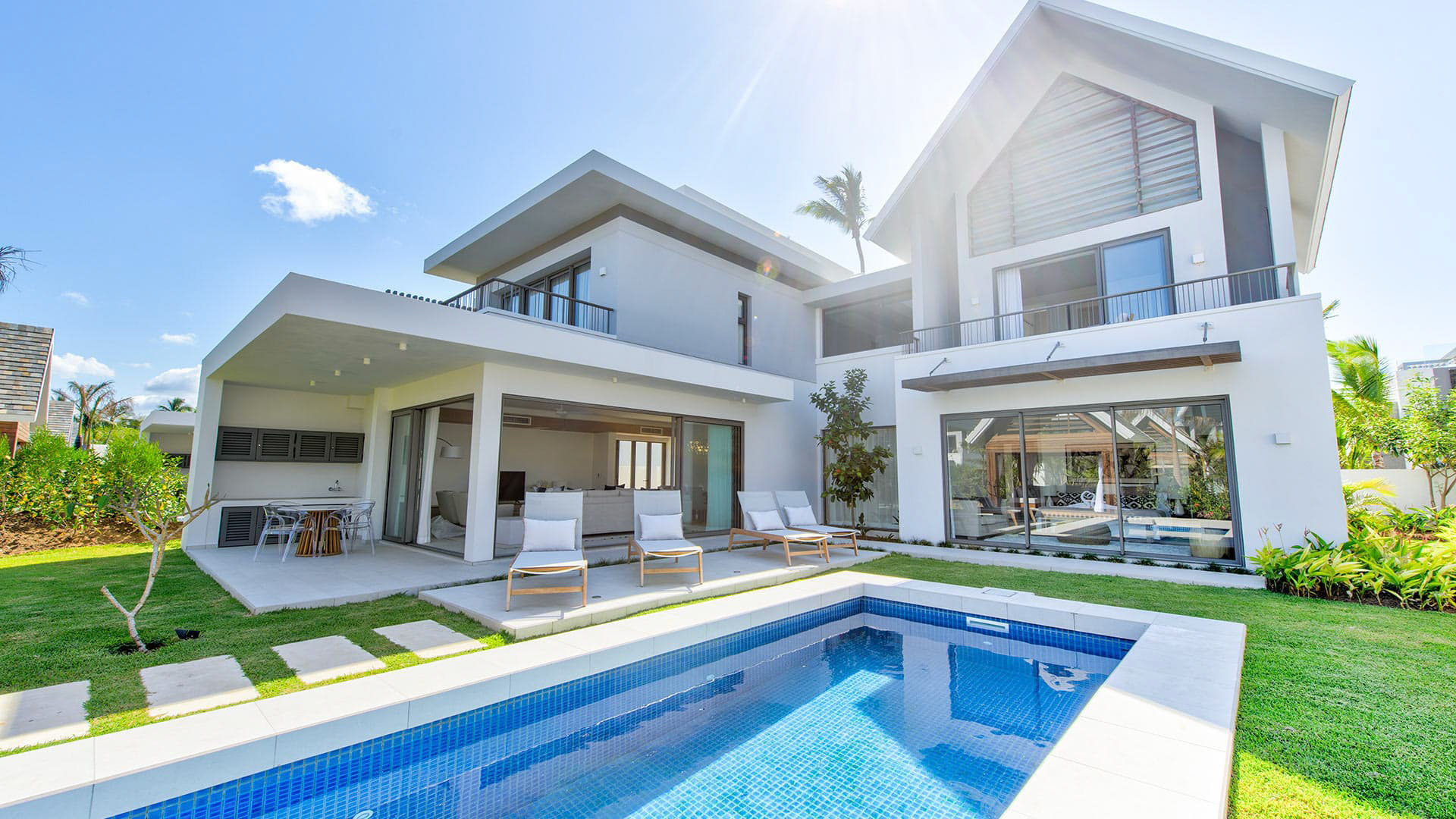 This 180m² Balinese inspired villa is located opposite to the Wolmar estate, on the West coast of Mauritius. Wolmar is a natural reserve of 600 hectares, home to more than 2,500 deer, wild boars, rabbits and monkeys.