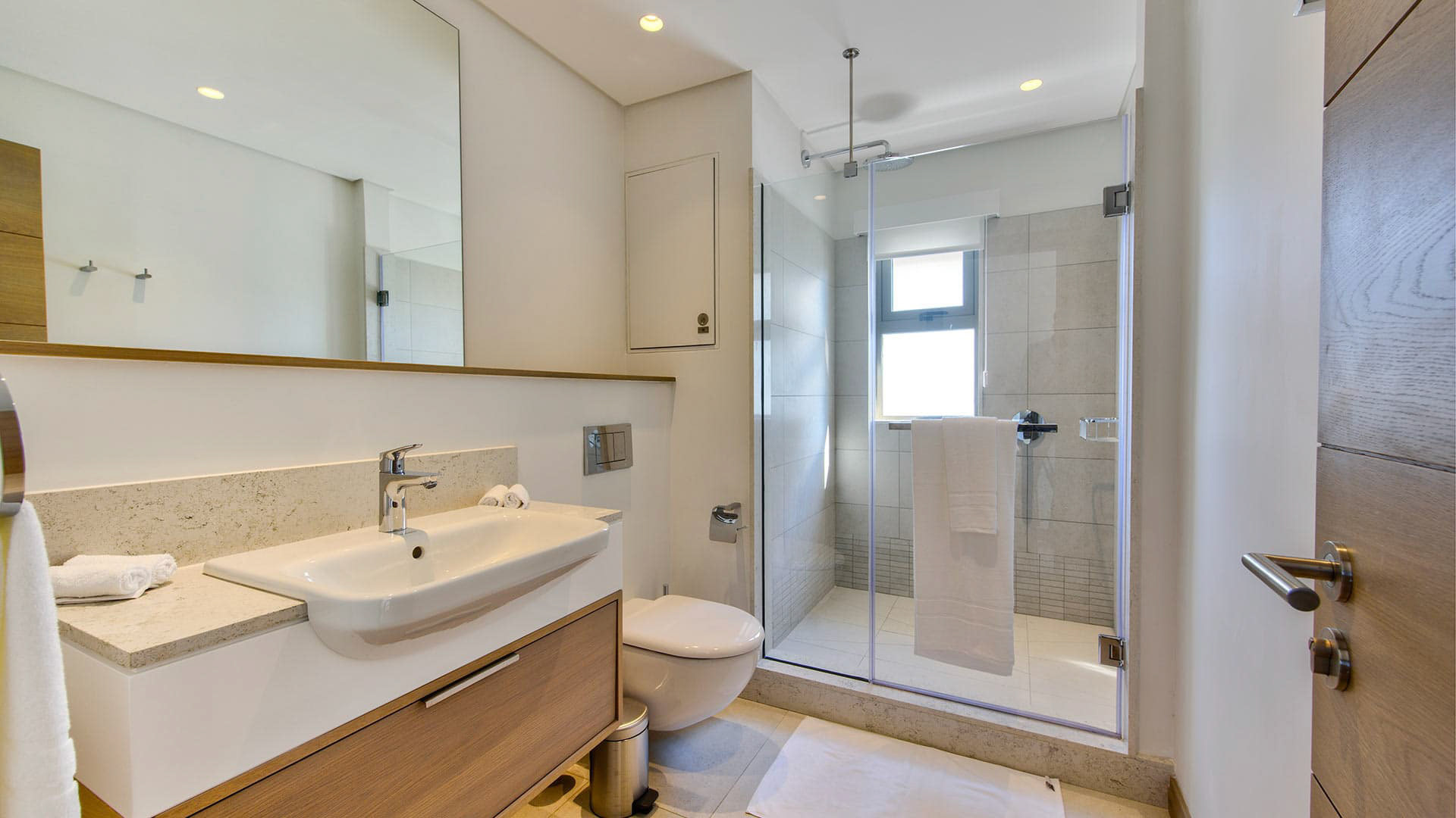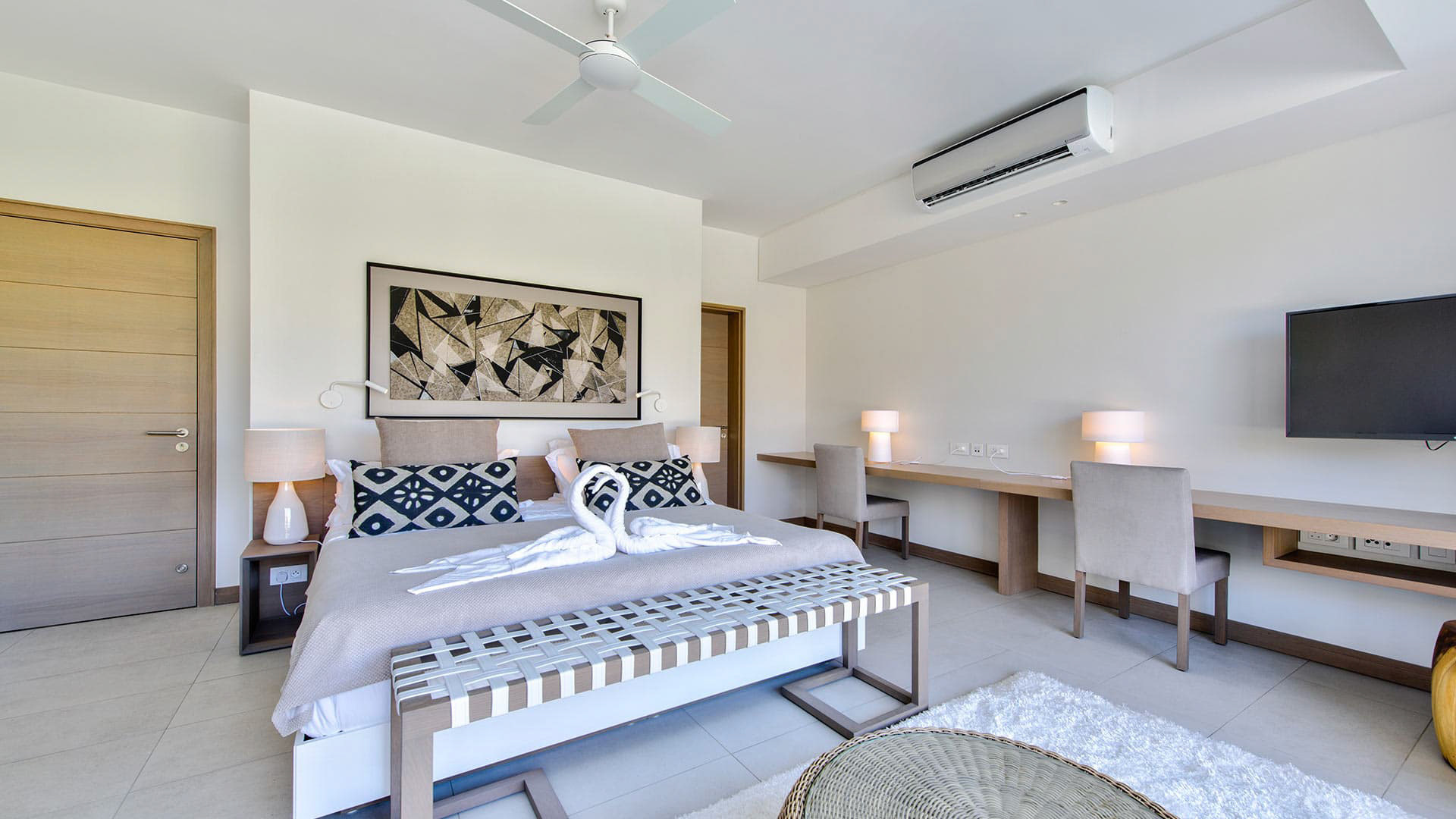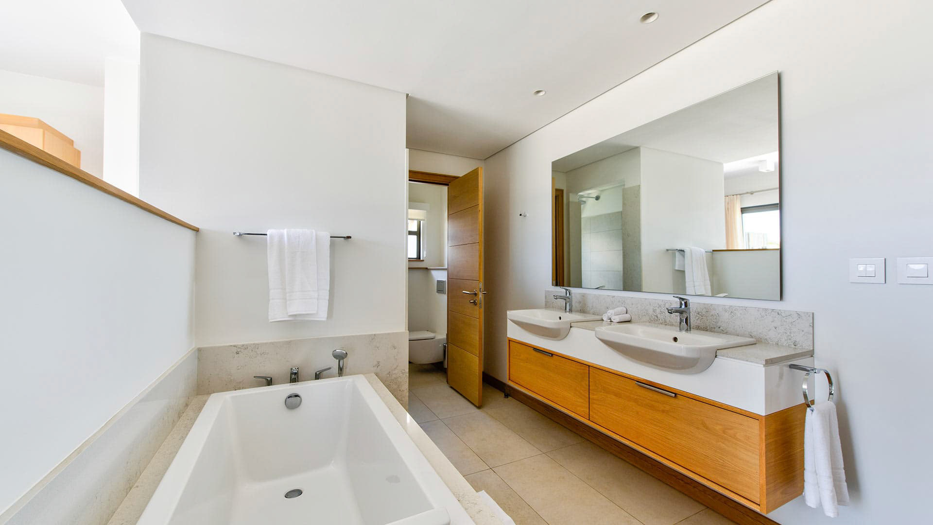Room, At apartment level. This bedroom has 1 double bed 220 cm. Bathroom ensuite, with 2 washbasins, shower. WC in the bathroom. This bedroom includes also air conditioning, dressing room.