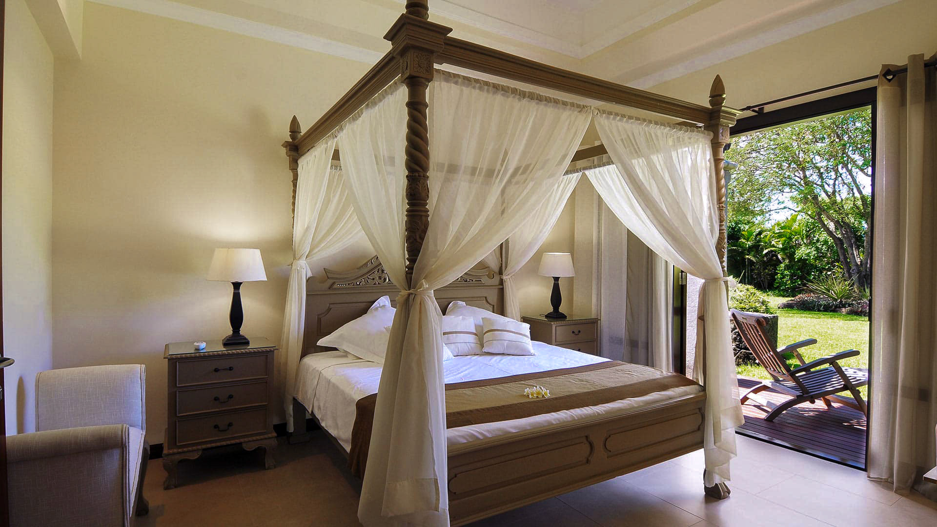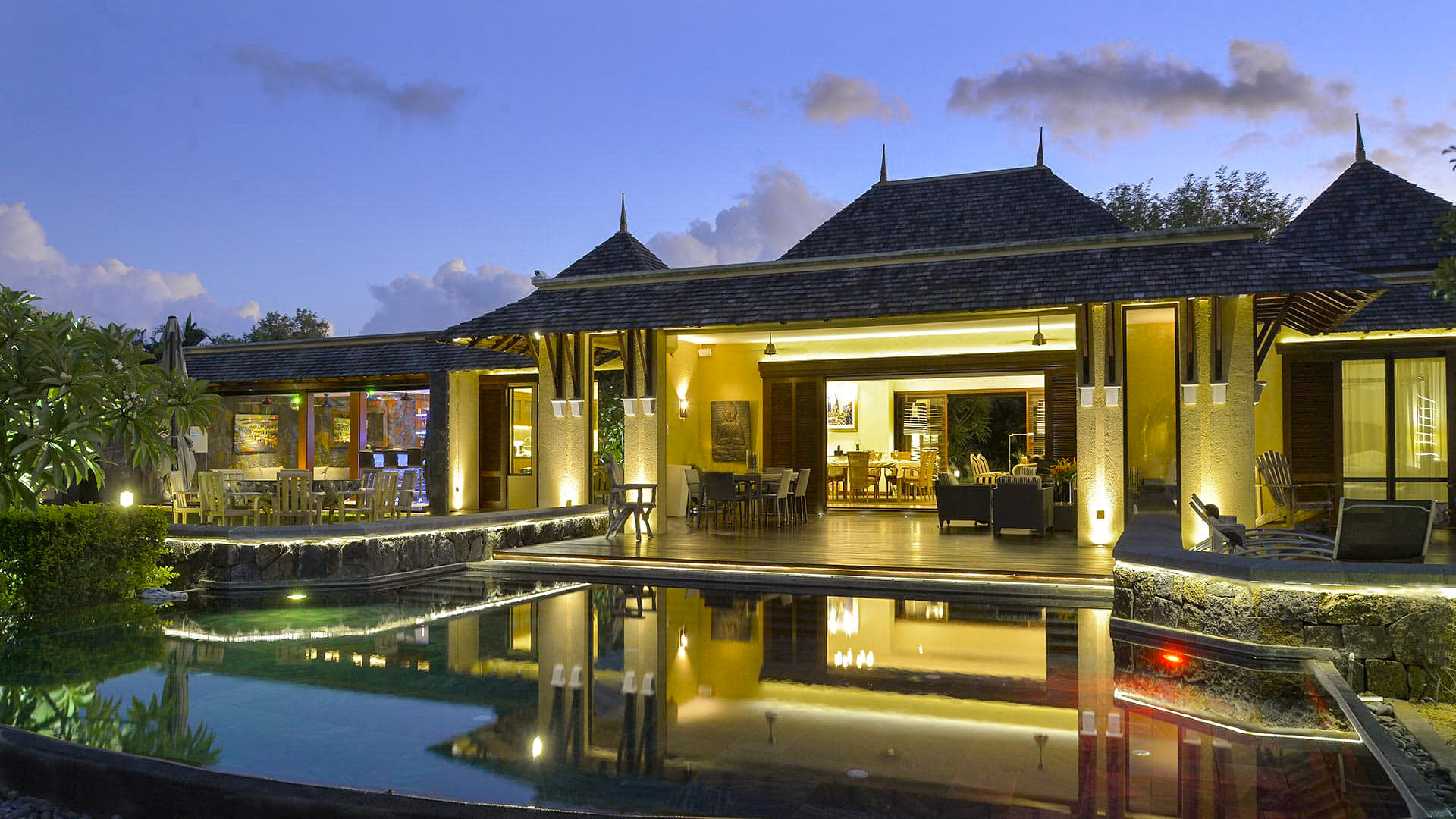Magnificent villa located on the West Coast of Mauritius in the luxury golf estate, 5 bedrooms with bathrooms, private pool, large garden with bar, petanque, fitness room Bedrooms Room 1 Room, Ground level, direct access to the terrace. This bedroom has 1 double bed. Bathroom ensuite. This bedroom includes also office area, TV. Room 2 Room, Ground level, direct access to the terrace. This bedroom has 1 double bed. Bathroom ensuite. This bedroom includes also office area, TV. Room 3 Room, Ground level, direct access to the terrace. This bedroom has 1 double bed. Bathroom ensuite. This bedroom includes also office area, TV. Room 4 Room, Ground level, direct access to the terrace. This bedroom has 1 double bed. Bathroom ensuite. This bedroom includes also office area, TV. Room 5 Room, Ground level, direct access to the garden, in another building. This bedroom has 1 double bed 180 cm. Bathroom ensuite, with shower. WC in the bathroom, separate WC room. This bedroom includes also air conditioning, TV, minibar, safe. Indoors The property is divided into 2 parts, the main house, which houses 4 bedrooms, and the small independent apartment in the garden, which houses the last bedroom. Superbly decorated, the villa is spacious, bright, modern and very airy. You will find a fully equipped kitchen, a living / dining room with table for 8 people, television and access to the terrace.